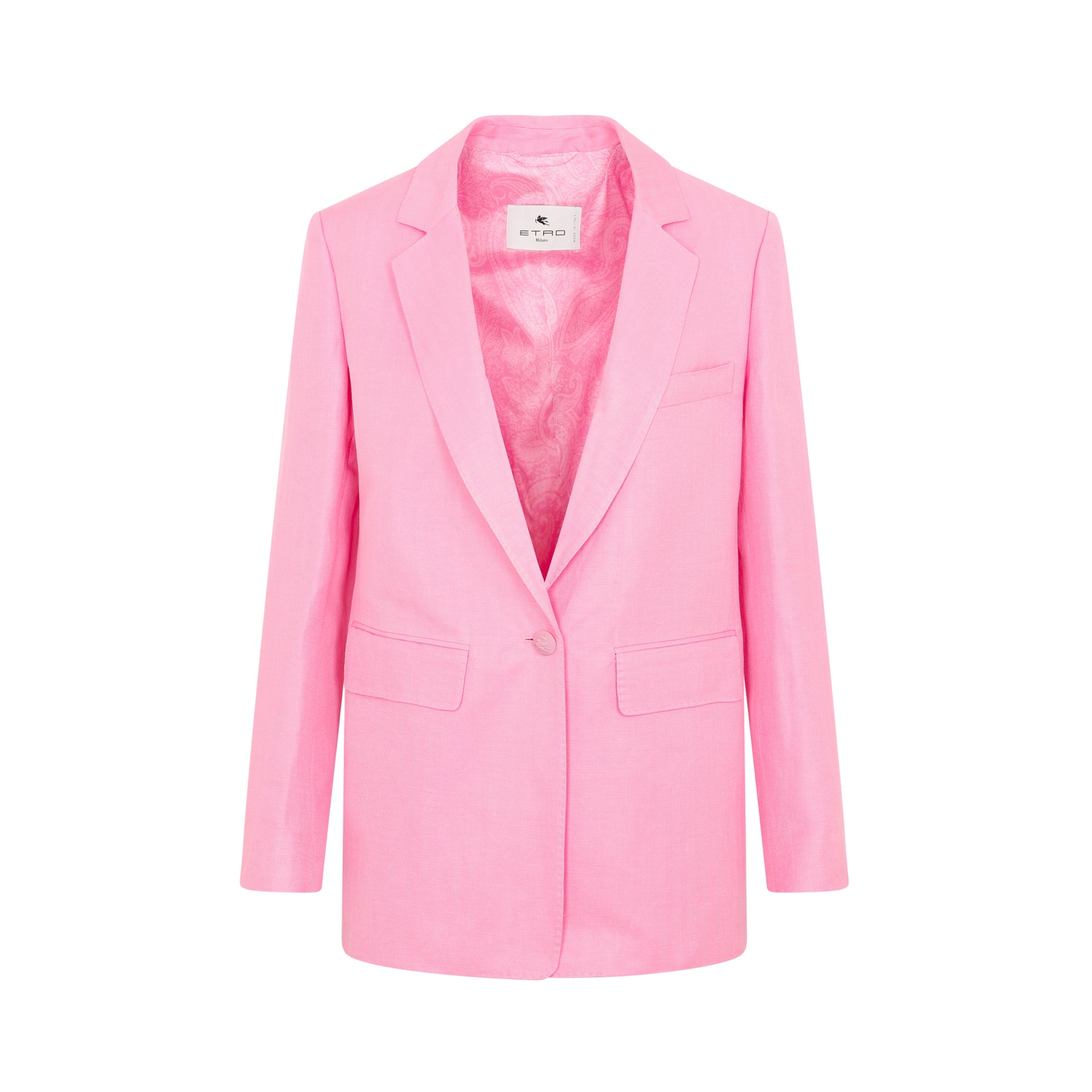 Etro Pink Linen and Silk Fuji Jacket. Crafted in a pink blend of linen and silk. Notched neckline, long sleeves, front button fastening, back vent, two front flap pockets, one welt chest pocket, straight hem, lined.