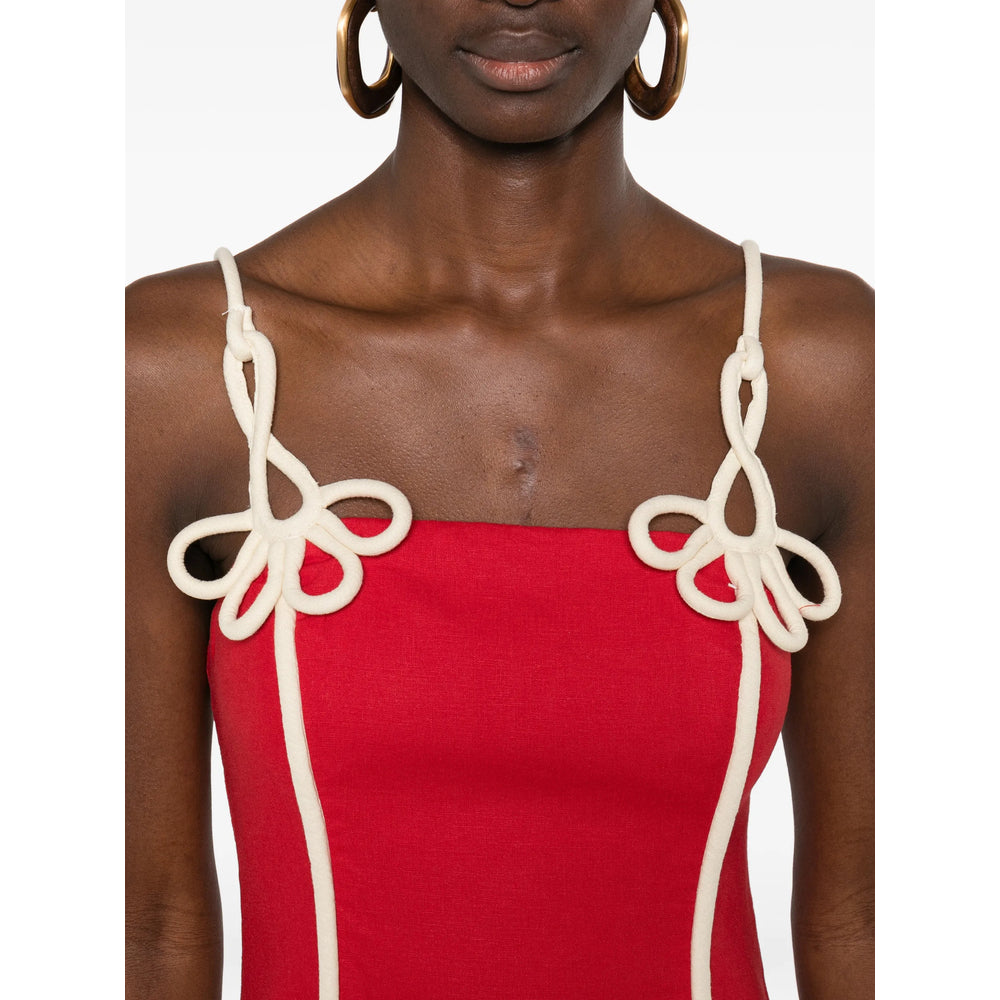 red flower detail piped trims sleeveless straight neck