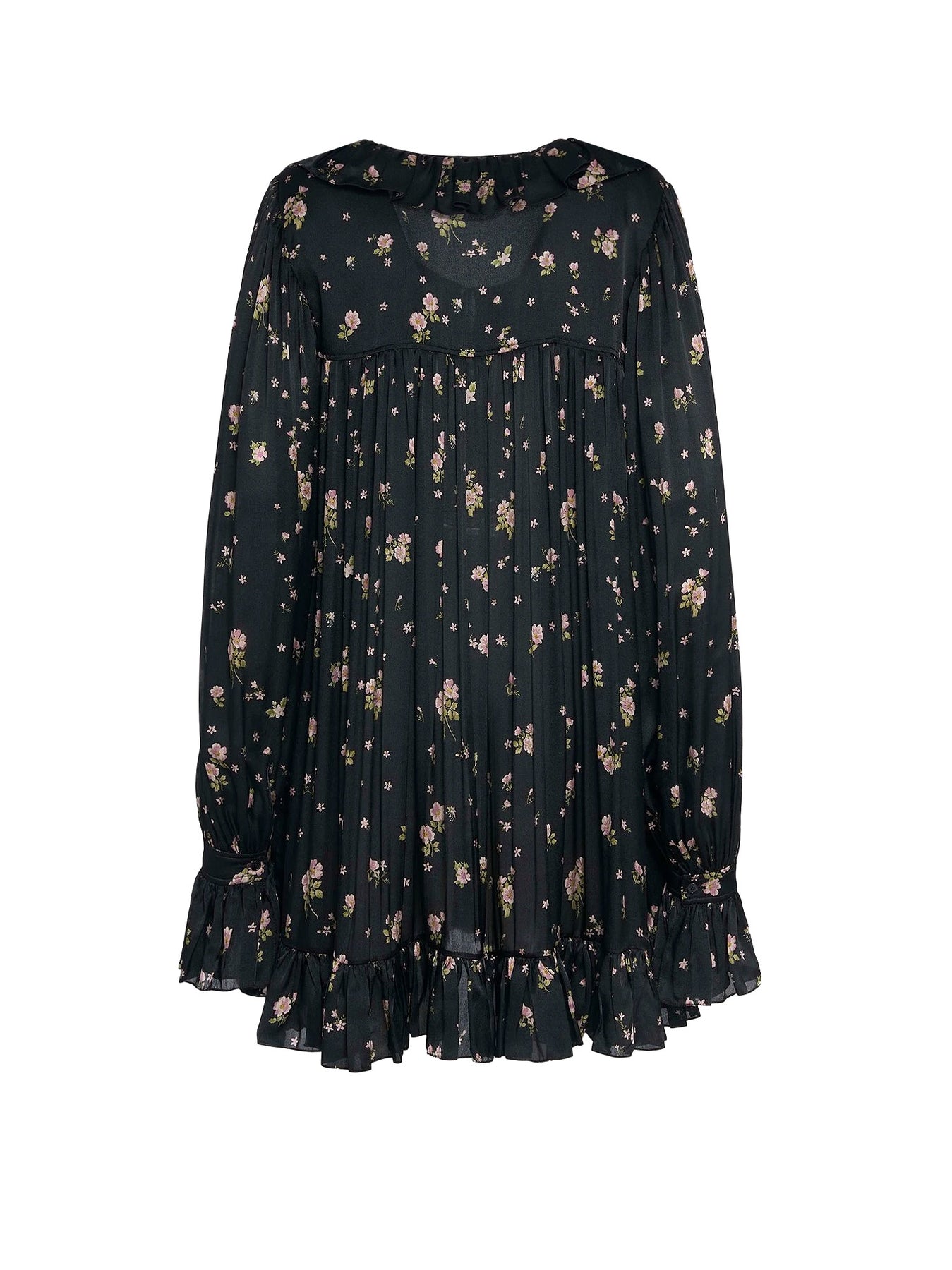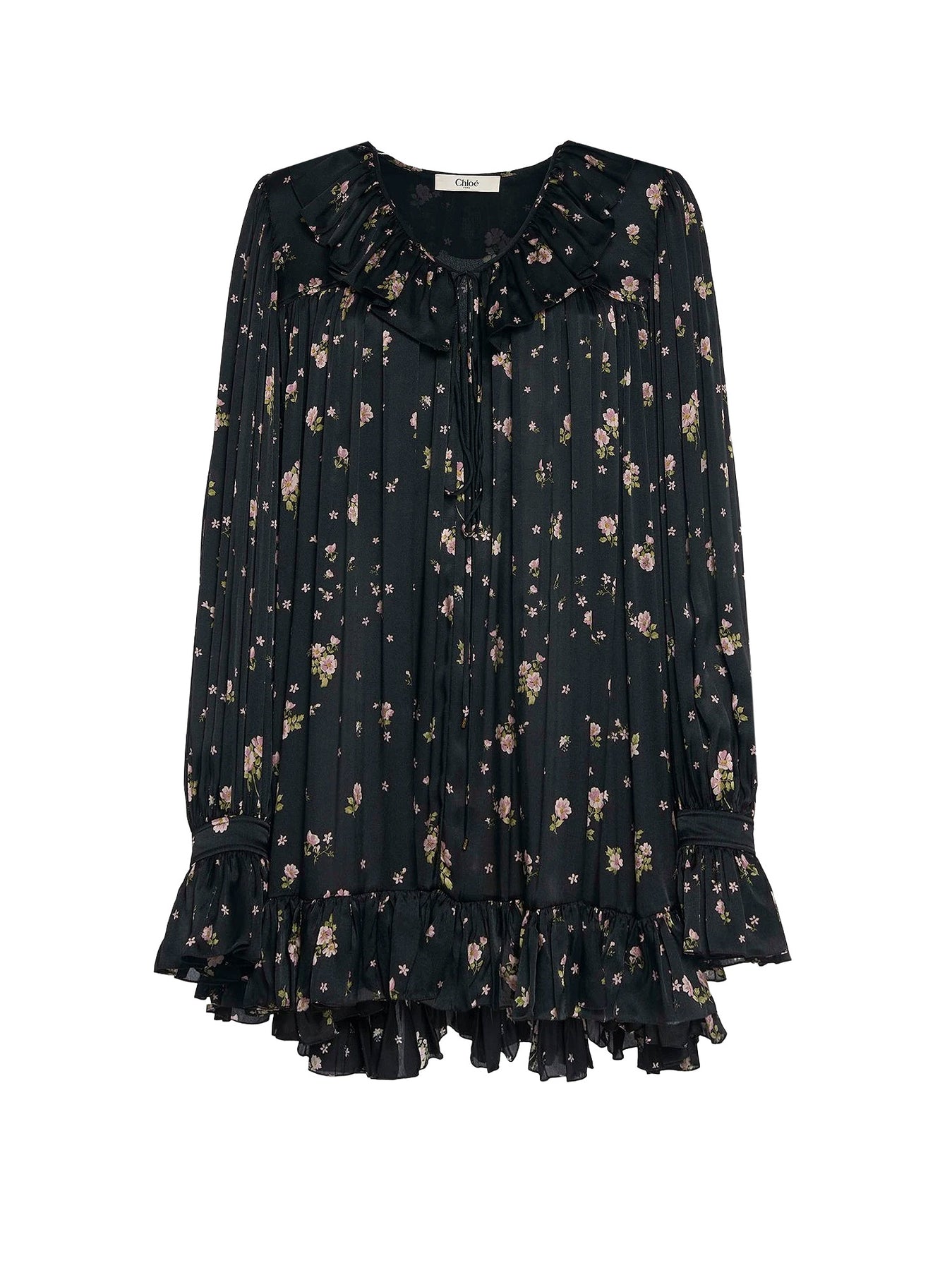 Rounded neckline with lace closure Profile with rouche Long sleeves with buttoned cuffs Floral motif 100% silk Lining: 68% acetate fiber, 32% silk SKU: CH25ARO26481001