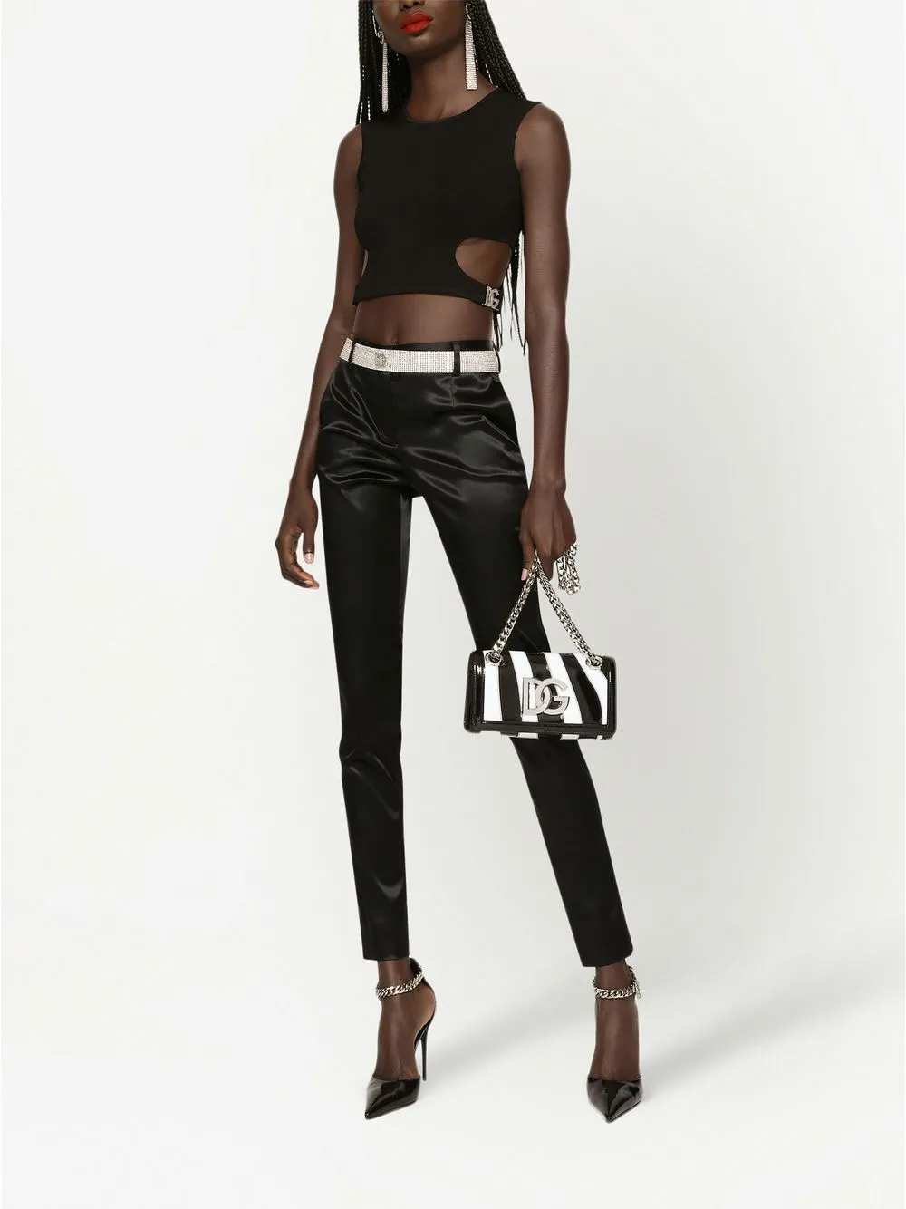 Cintura con logo DG Origine: Italia Caratteristiche Color argento, decorazione in cristalli, dettagli applicati e chiusura con gancio e occhiello. Composizione vetro 30%, cotone 25%, ottone 10%, rame 10%, acetato 10%, nylon 10%, zinco 5% ID WLO6Z4W1111
