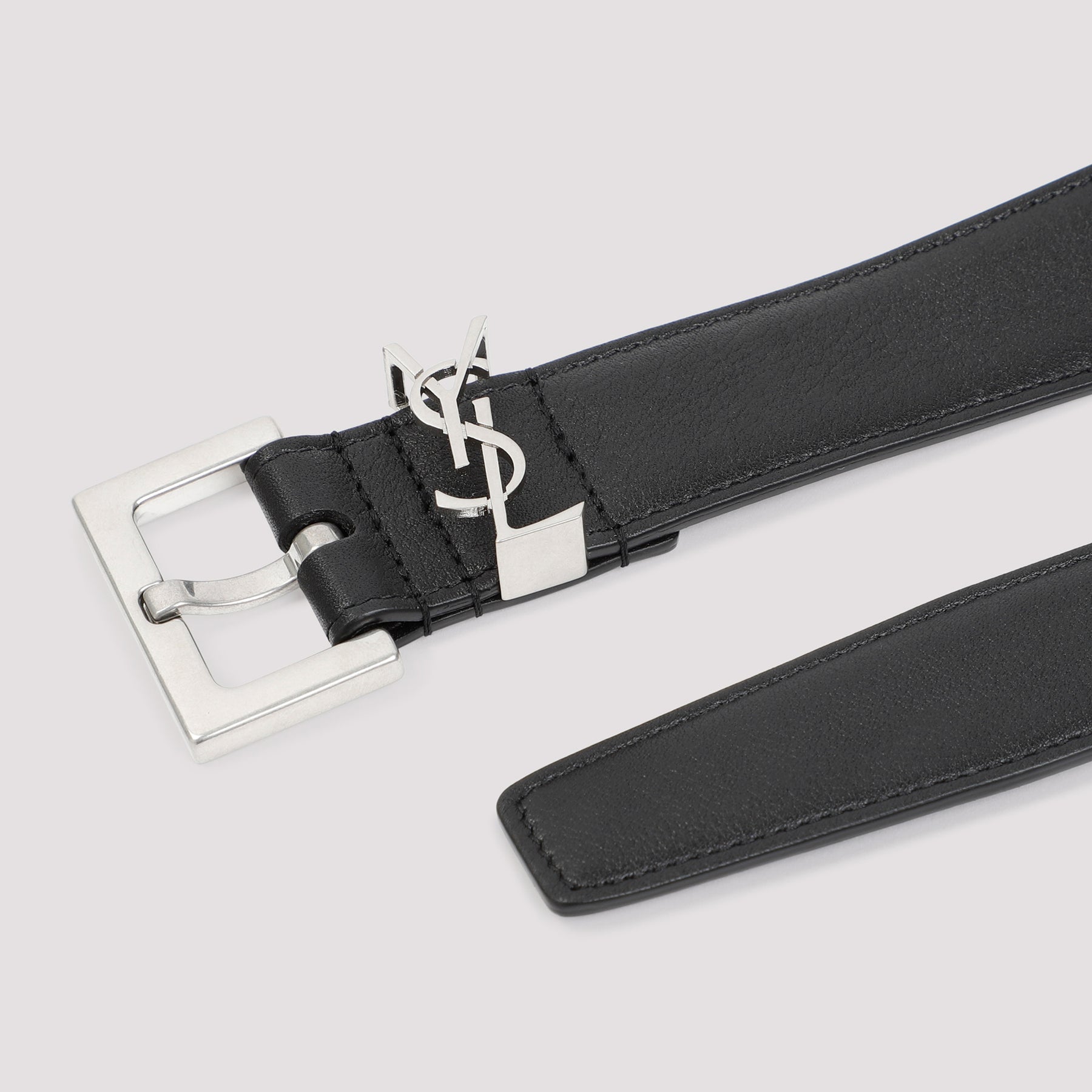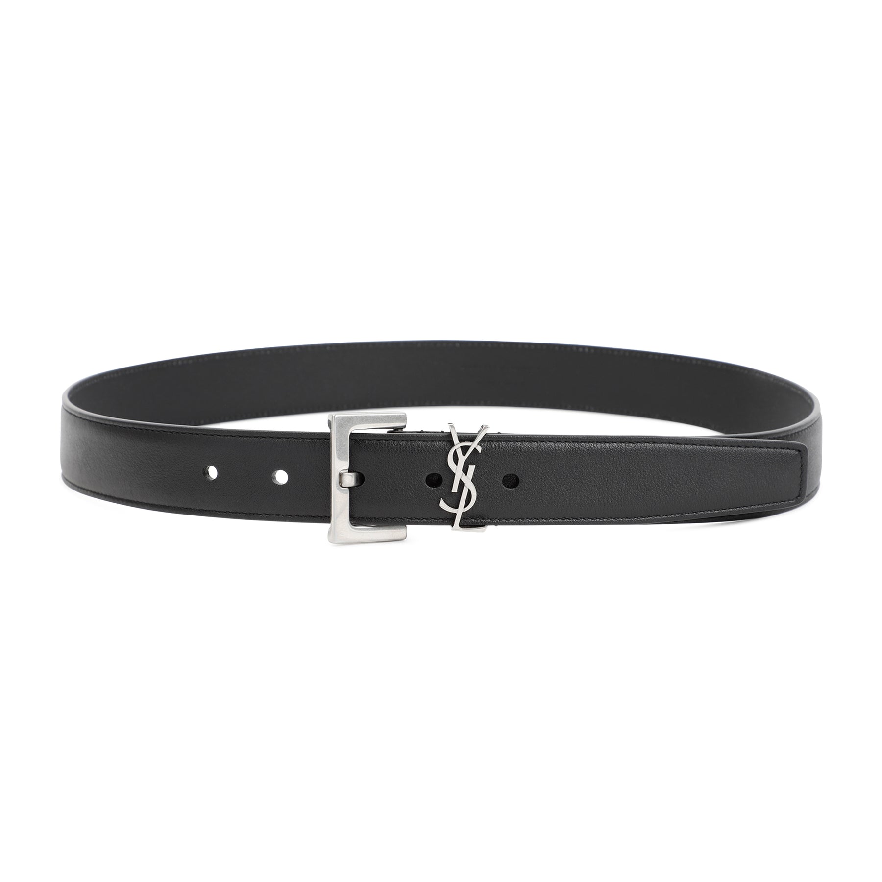 Saint Laurent Black Leather YSL Belt. Crafted in pure black lamb leather. Adjustable, silver hardware, square buckle, "YSL" logo belt loop.
