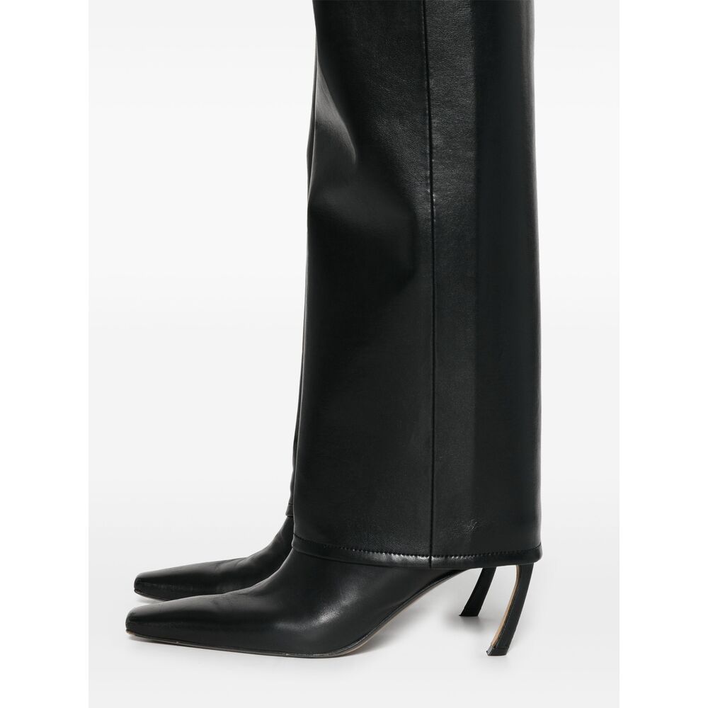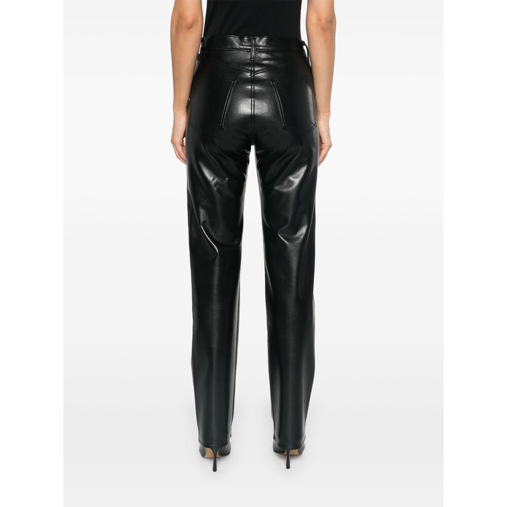 black recycled leather blend smooth grain high-shine finish concealed fly and button fastening high waist belt loops classic five pockets straight leg
