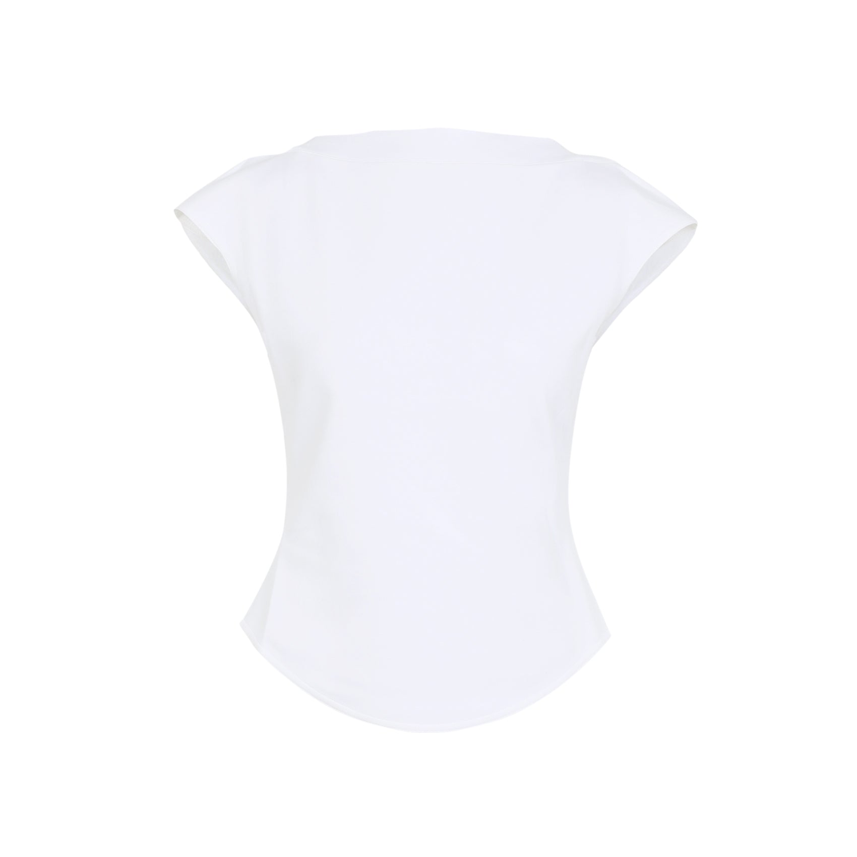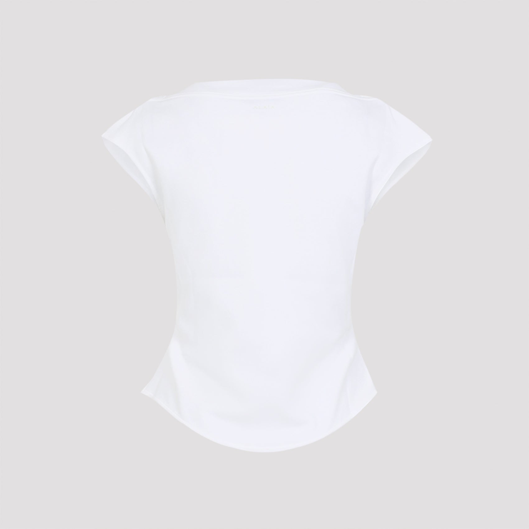 Alaïa Cap White Cotton T-shirt. Crafted from a white cotton blend, it features an elegant boat neckline, a sleeveless design, a rounded hem, and a fitted waist.