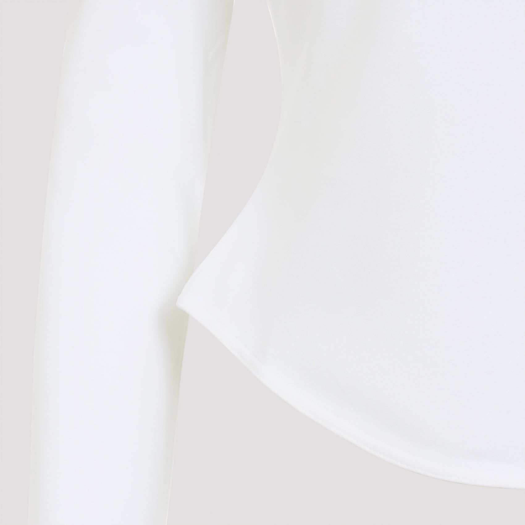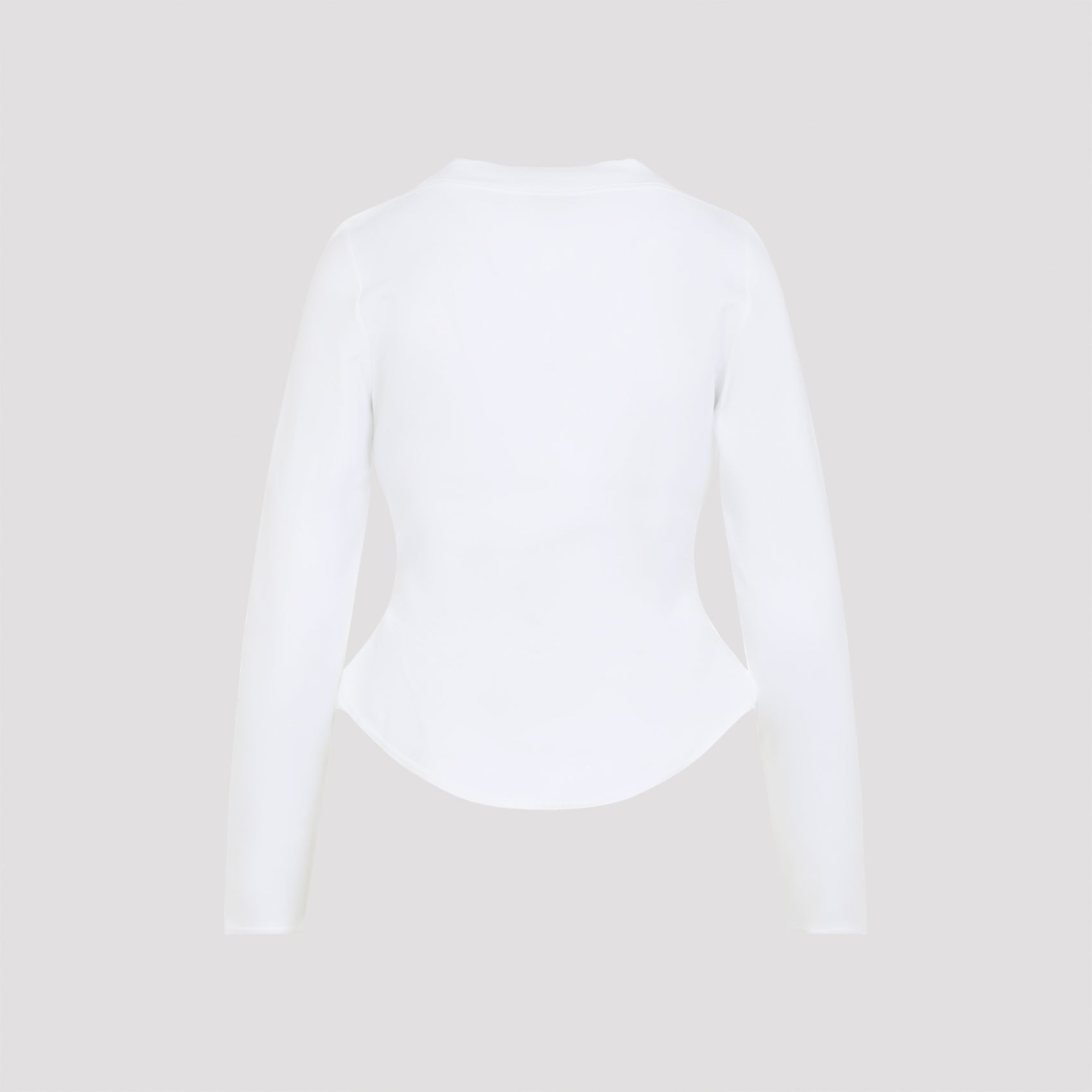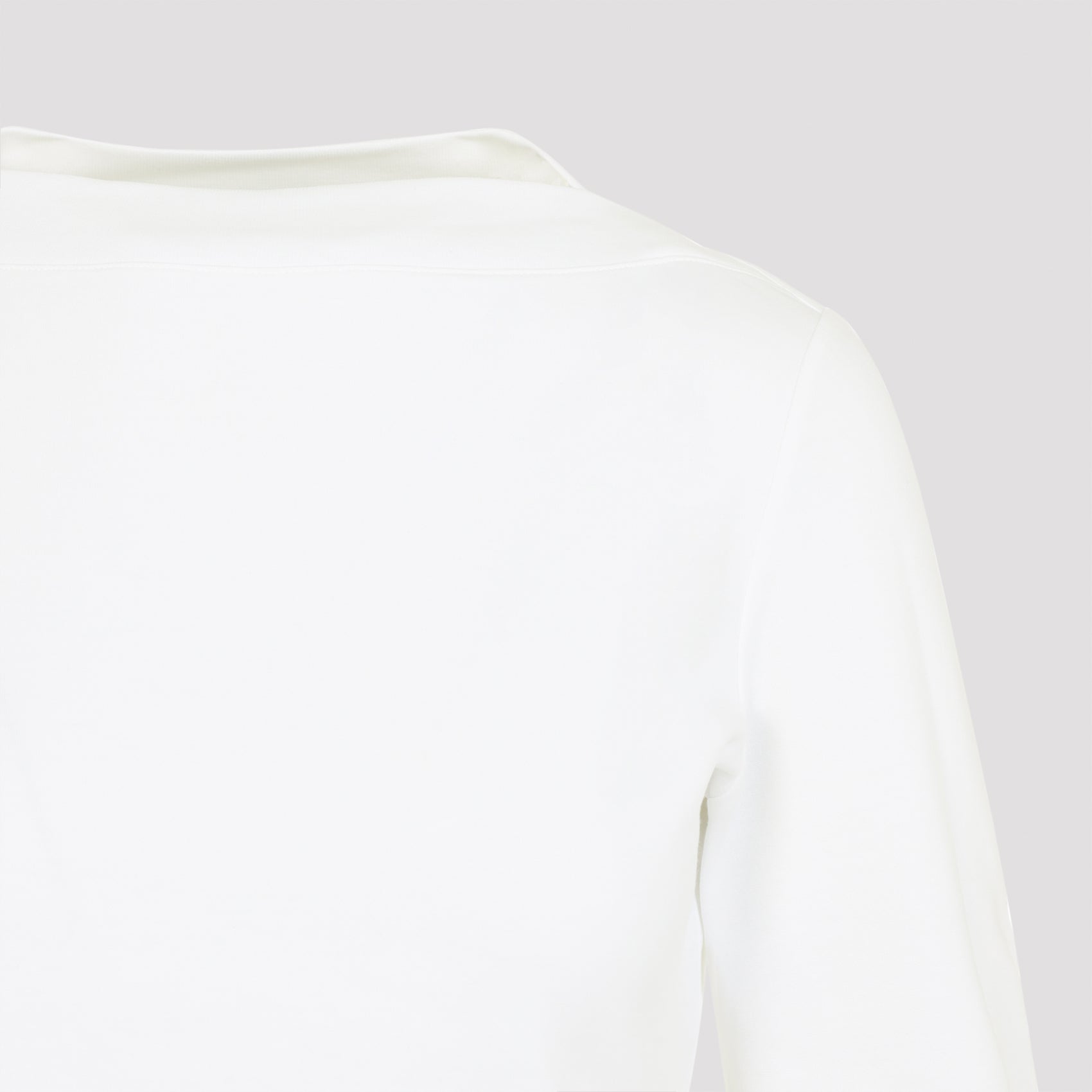 Alaïa LS White Cotton T-shirt. Crafted from a white cotton blend, it features an elegant boat neckline, long sleeves, a rounded hem, and a fitted waist.