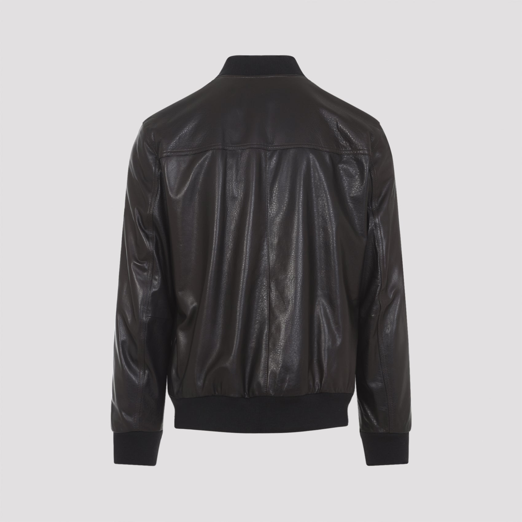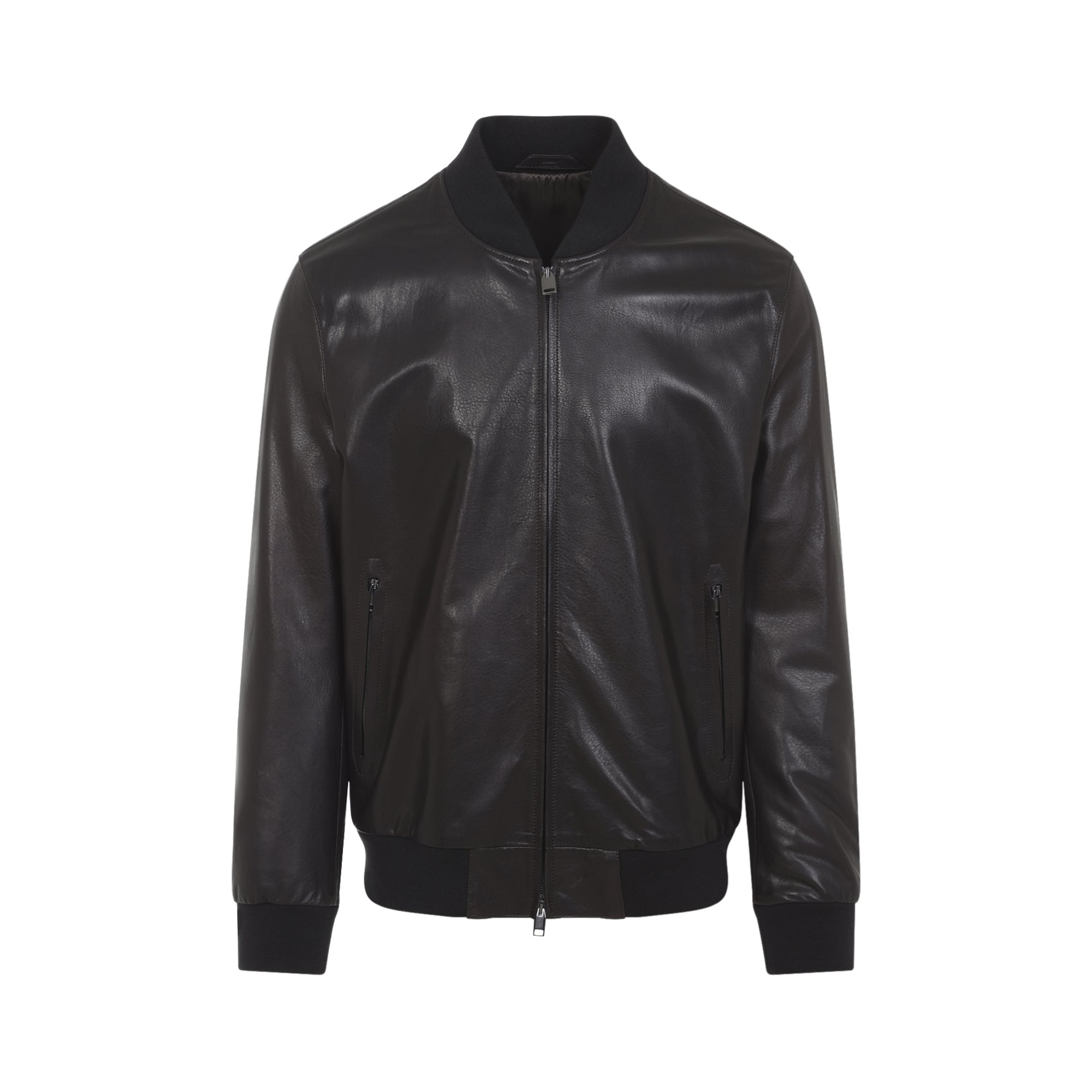Brioni Coffee Brown Leather Bomber Jacket. Pure coffee brown leather jacket, stand-up ribbed collar, front zipped fastening, side zipped pockets, long sleeves, ribbed cuffs and hem, straight hem.