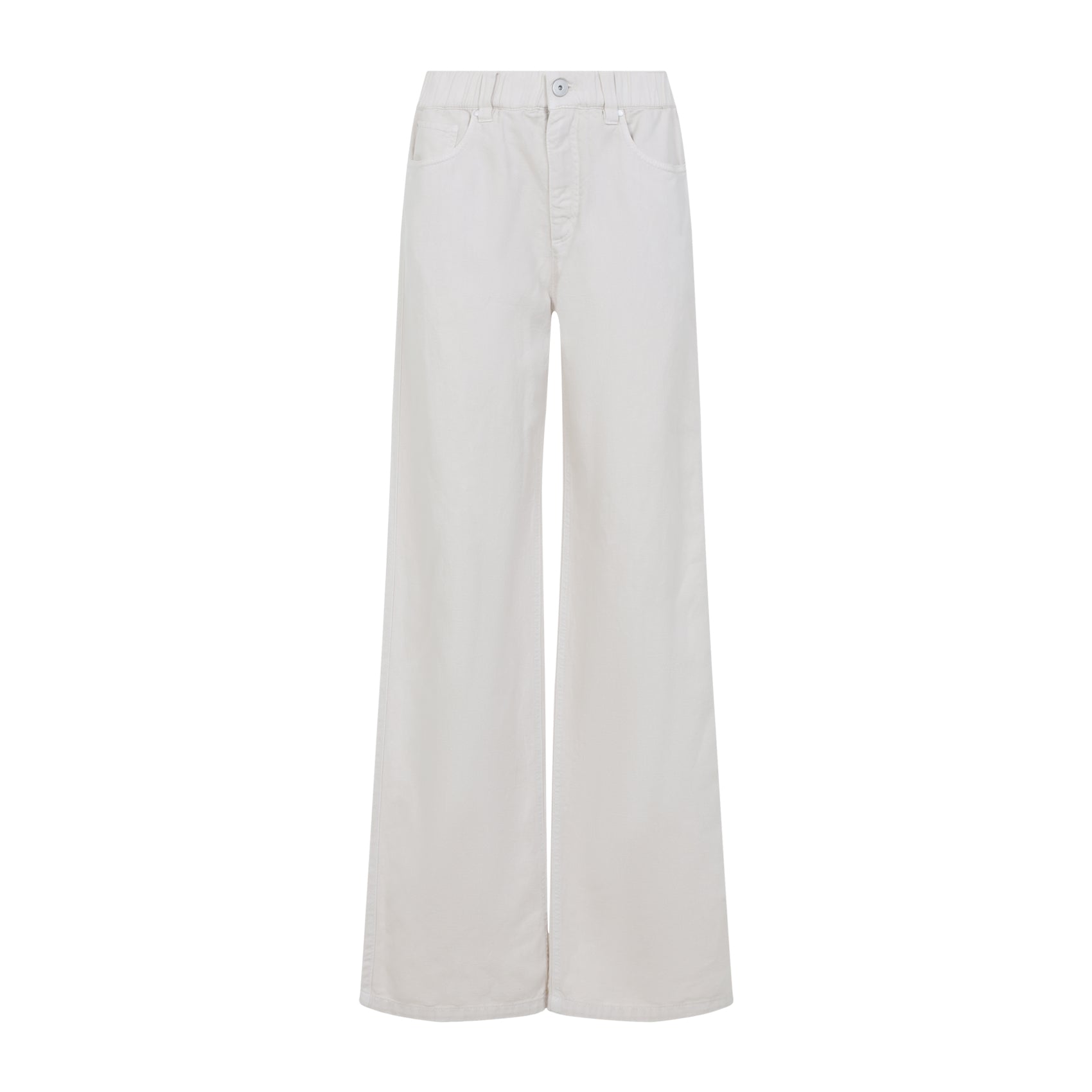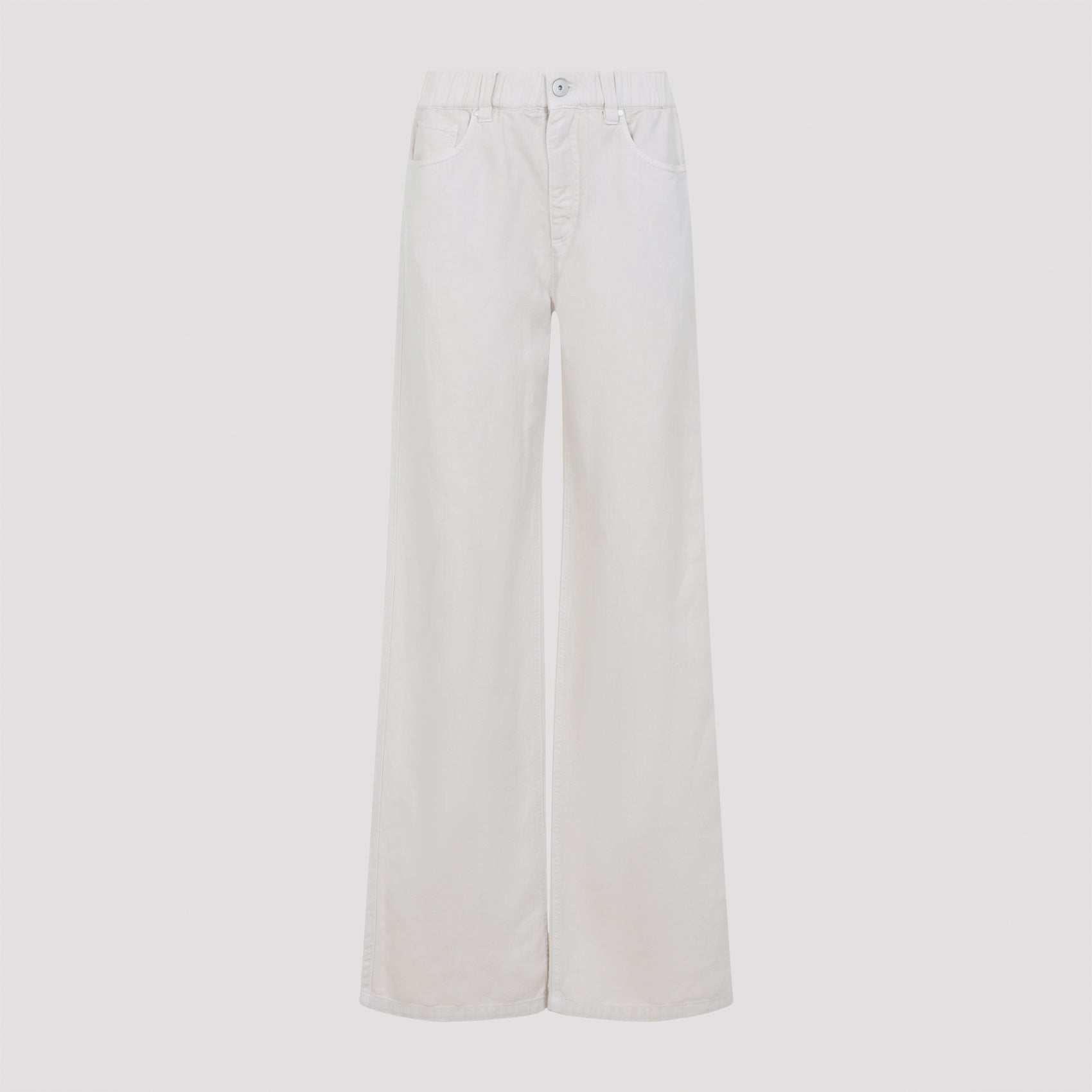 Brunello Cucinelli Chalk White Cotton Bull Straight Pants. Crafted in cotton and linen. Front concealing zipped fastening, front buttoned fastening, belt loops, five pockets design, back elastic waist, wide flared legs, straight hem.