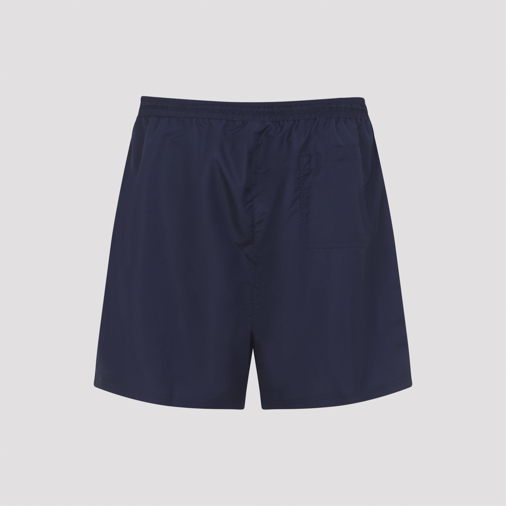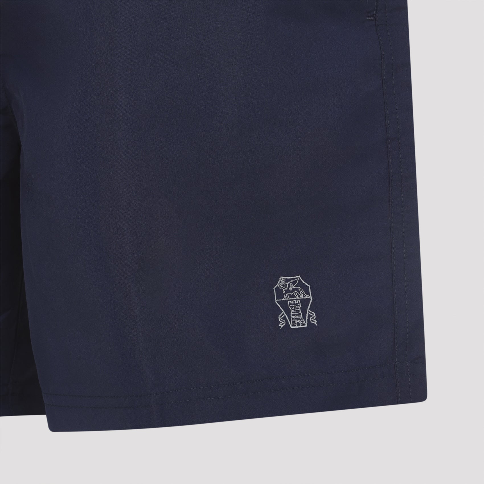 Brunello Cucinelli Navy Polyester Swim Shorts. Navy tech fabric, elastic waistband with drawstring, inseam side pockets, logo at the front edge, patch pocket on the back, straight hem, lined.