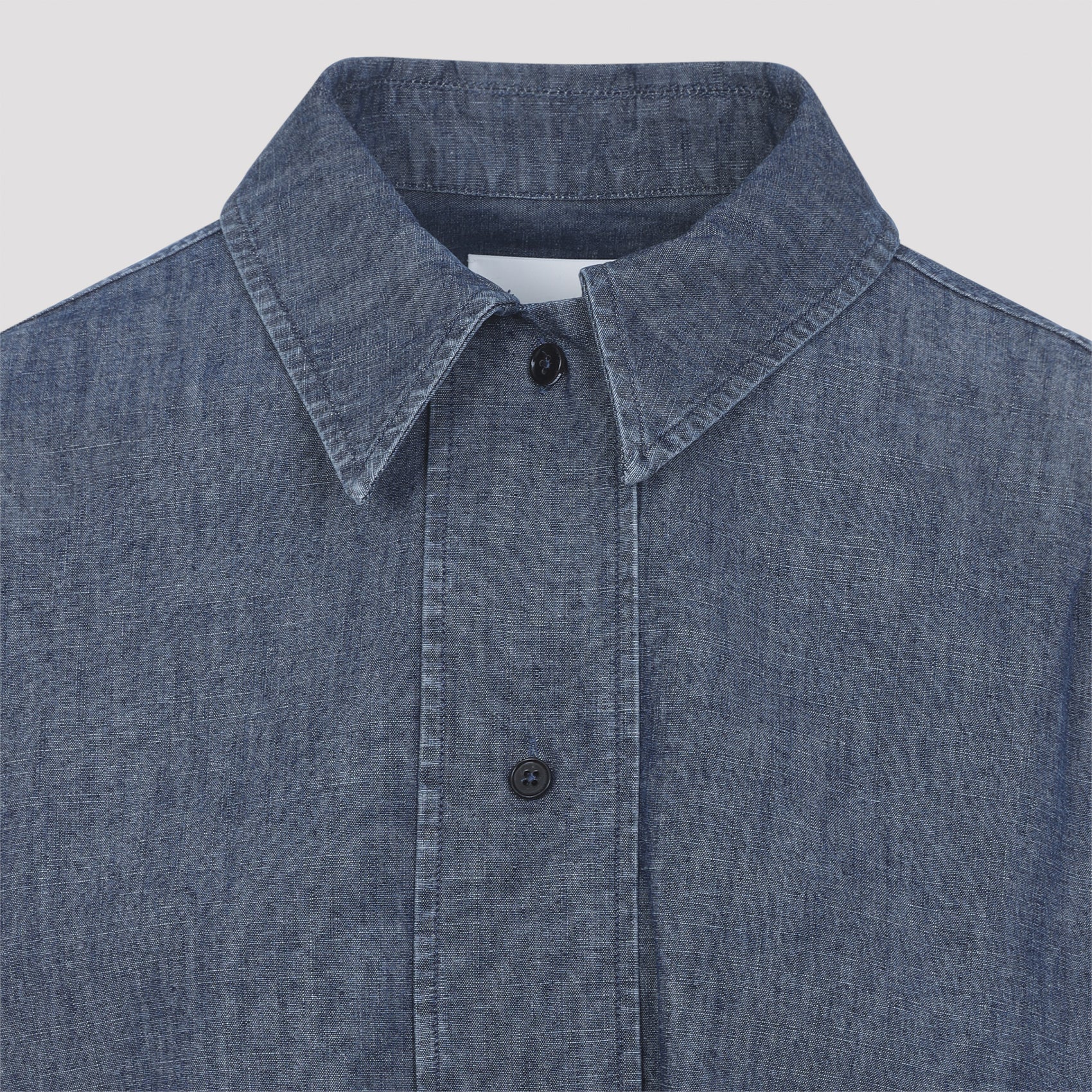 Jil Sander Boxy Blue Cotton Shirt. Three-quarter sleeve shirt crafted from indigo-blue cotton, featuring a pointed collar, front button fastening, dropped shoulders, a back yoke and two pleats, and a straight hem.