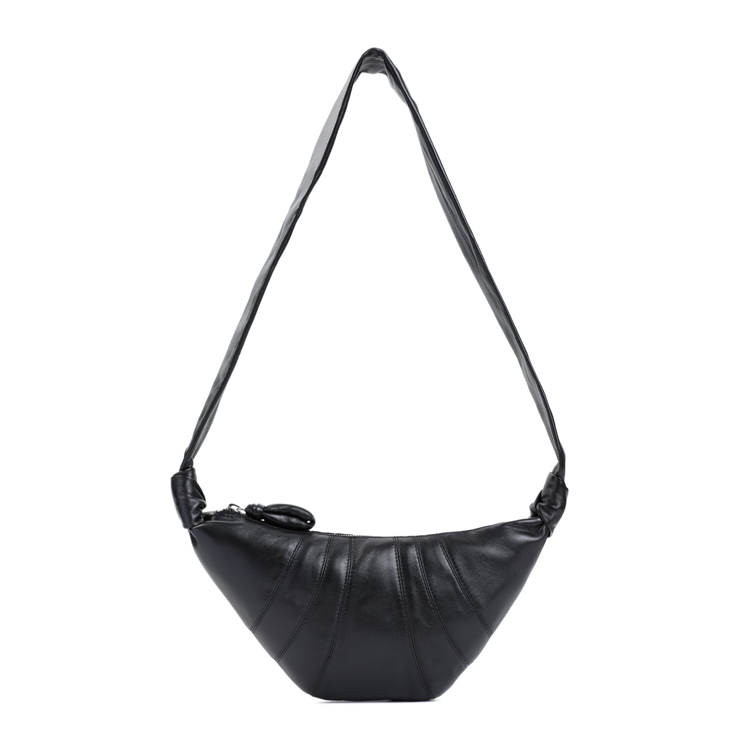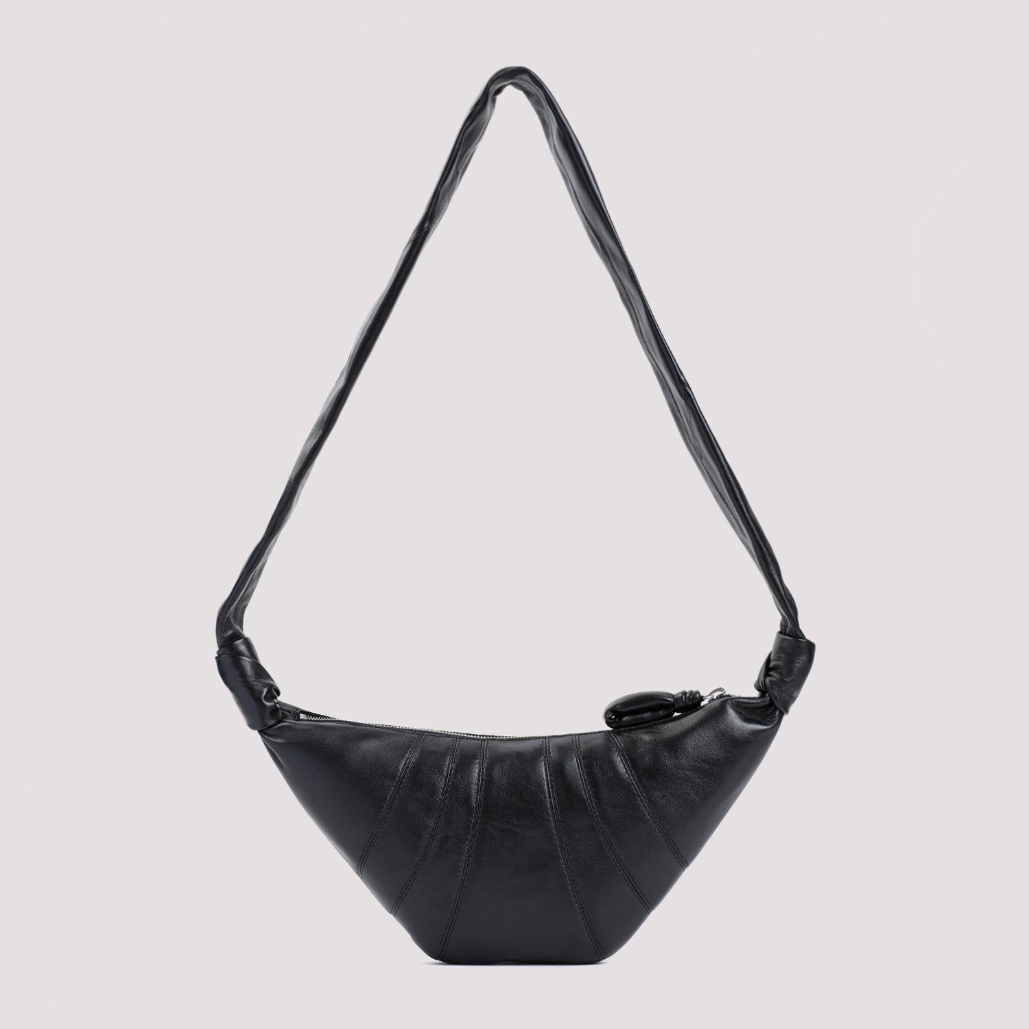 Lemaire Black Leather Croissant Zip Bag. Black leather, panelled design, tonal shoulder strap with knotted details, zip closure. Silver-colored metal hardware, cotton lining.