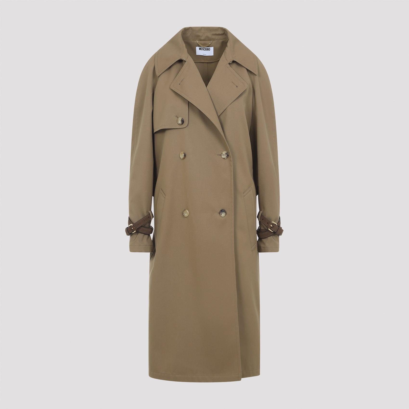 Moschino Brown Trench. Crafted in polyester and cotton. Notched collar, chest flap detail, front buttoned fastening, double-breasted detail, back flap detail, side pockets, long sleeves, adjustable brown strap on the cuffs, midi-length, straight hem.