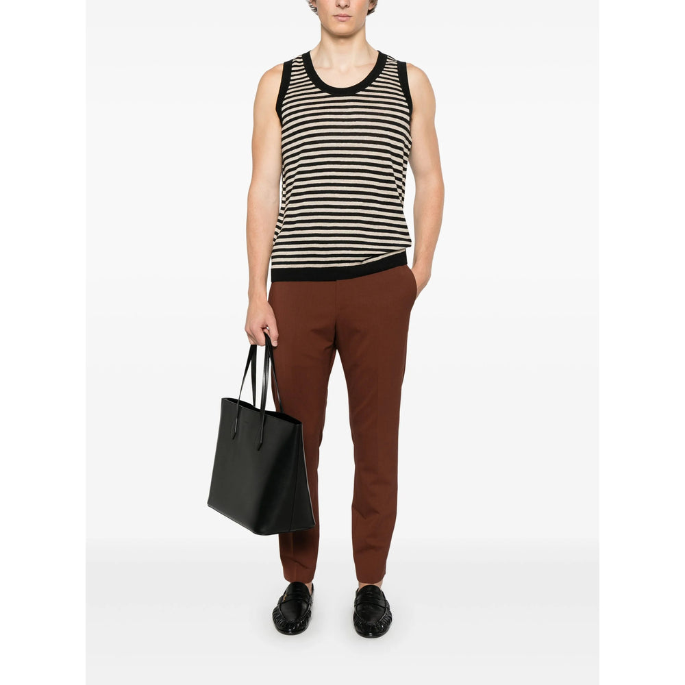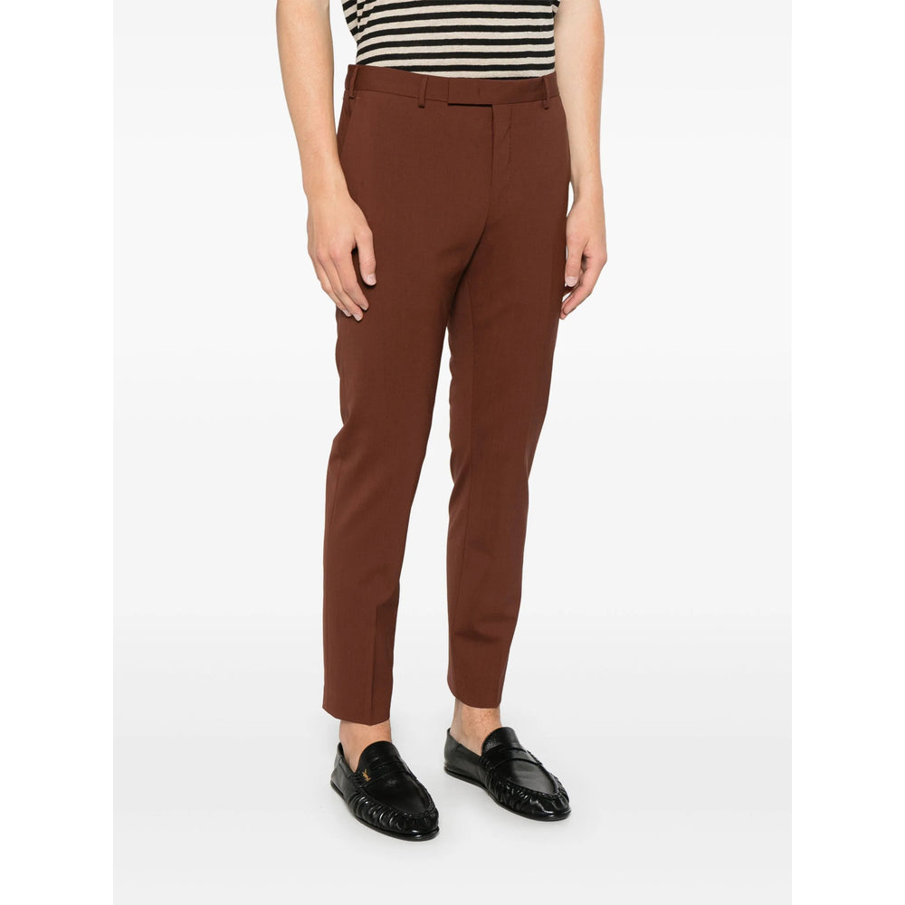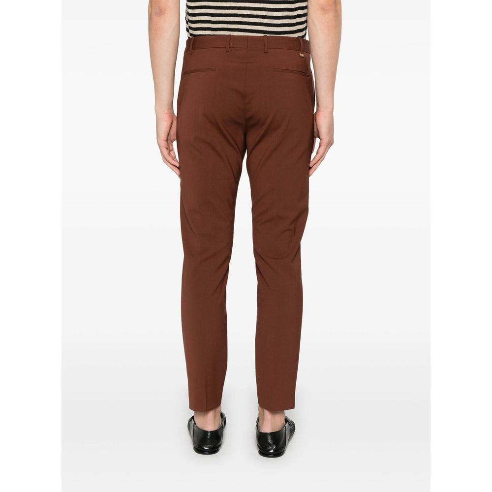 brown concealed front fastening two side slit pockets two rear welt pockets pressed crease