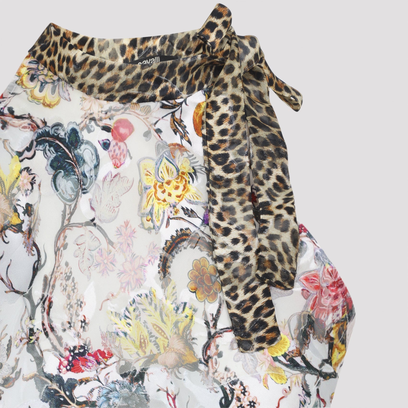 Roberto Cavalli Florentine Flowers White Viscose Top. Halter-neck top crafted from white viscose with an all-over signature print, featuring an animalier silk self-tie collar, and slightly flared hem.