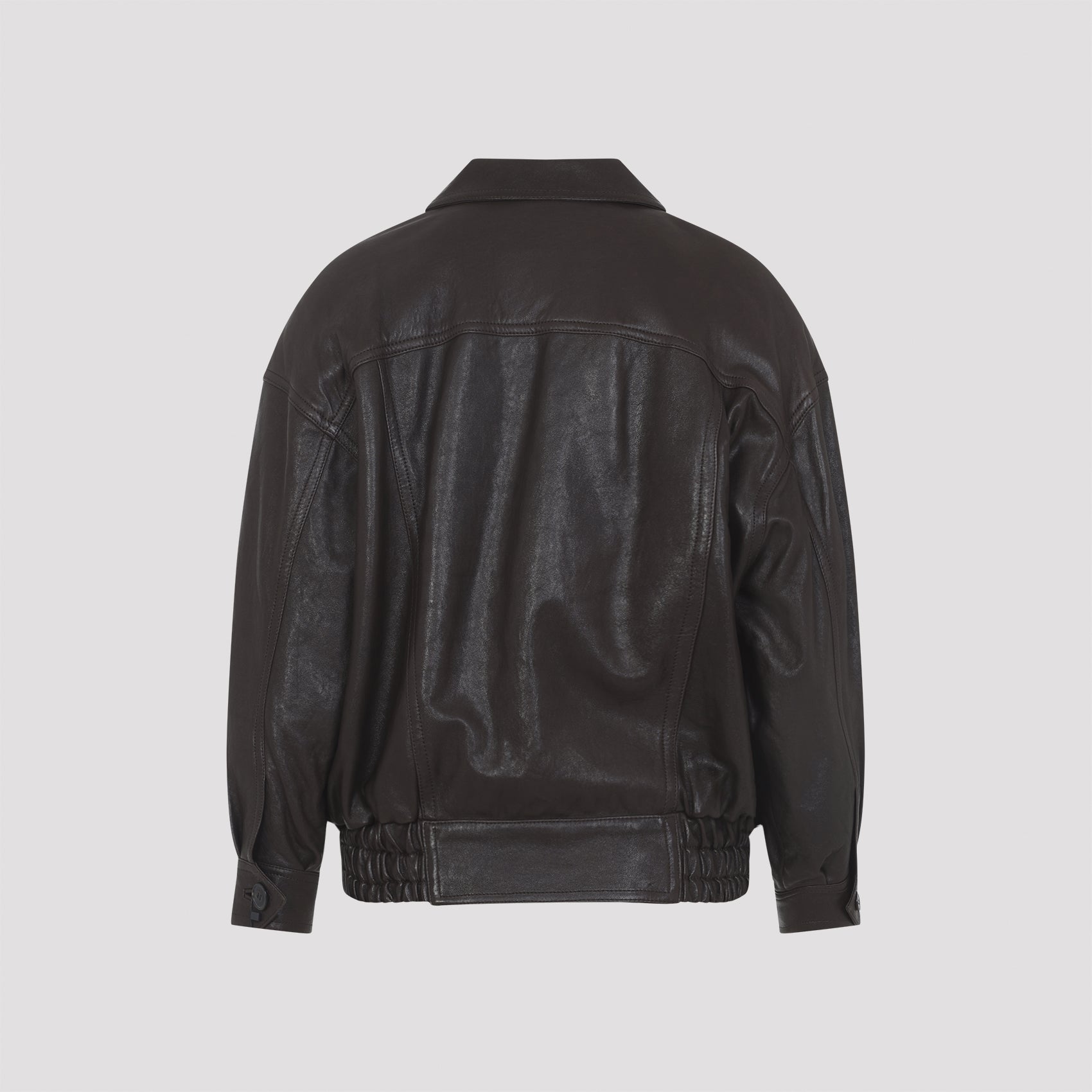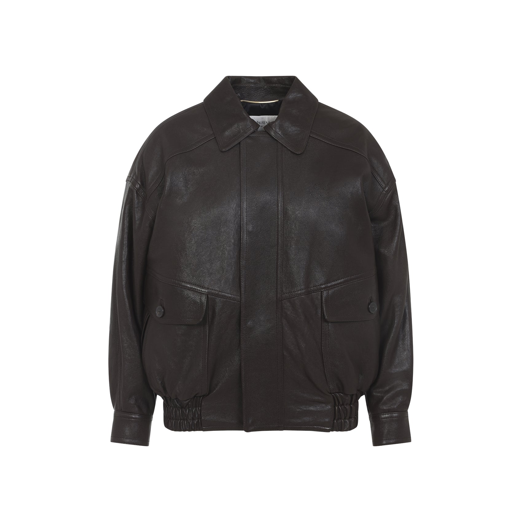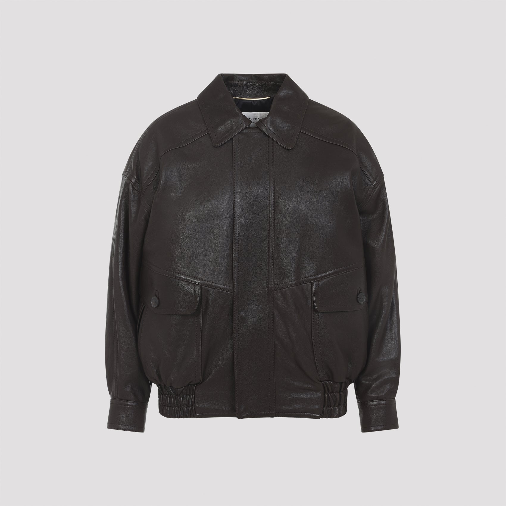 Saint Laurent Brown Lamb Leather Jacket. Crafted from dark brown lamb leather, featuring a pointed collar, a concealed zip and snap button fastening, two flap pockets on the front, padded shoulders, long sleeves with one-button cuffs, a shirred waist, and a cotton and viscose lining.