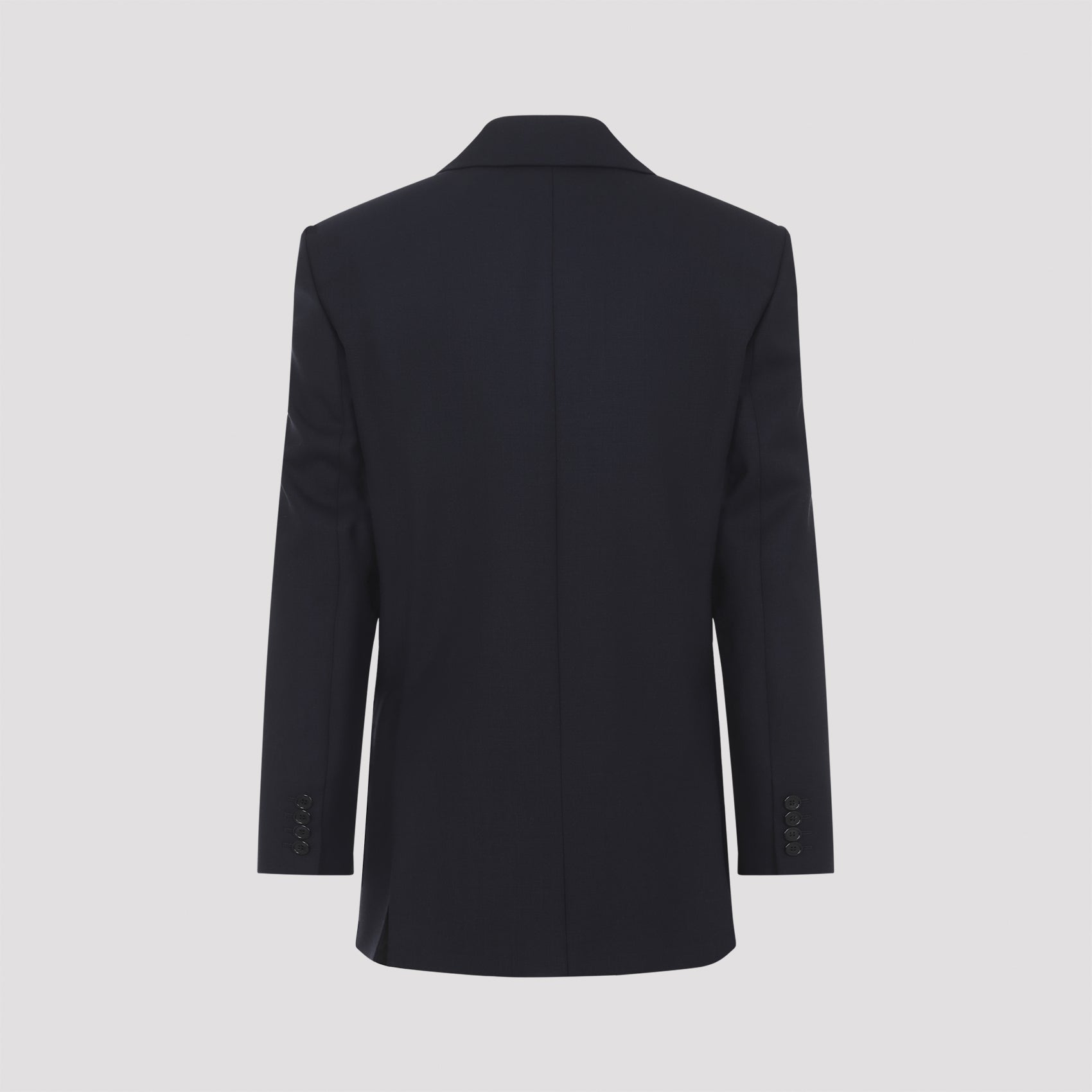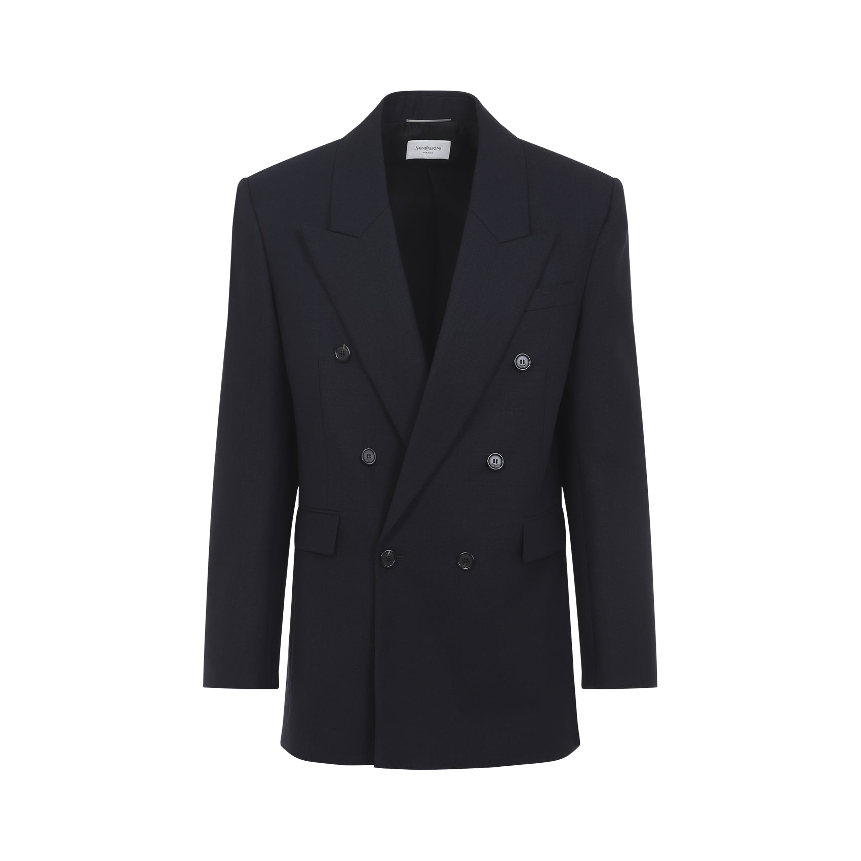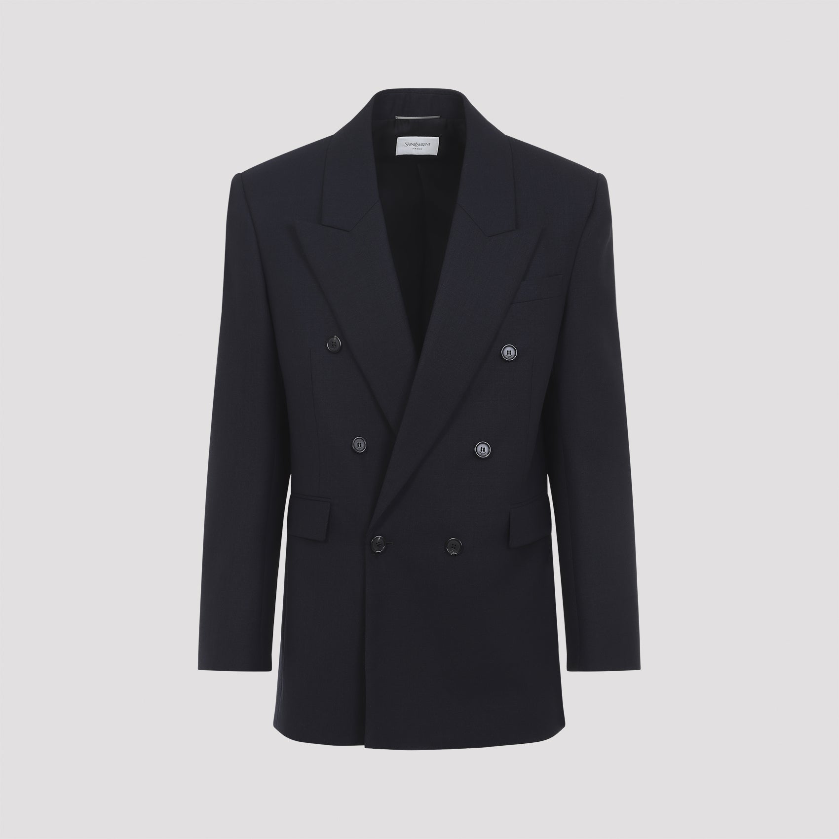 Saint Laurent Blue Wool Jacket. Double-breasted jacket, crafted from dark blue wool, featuring peak lapels, front button fastening, a welt pocket on the chest, two front flap pockets, padded shoulders, long sleeves with buttoned cuffs, two back vents, and a full lining.