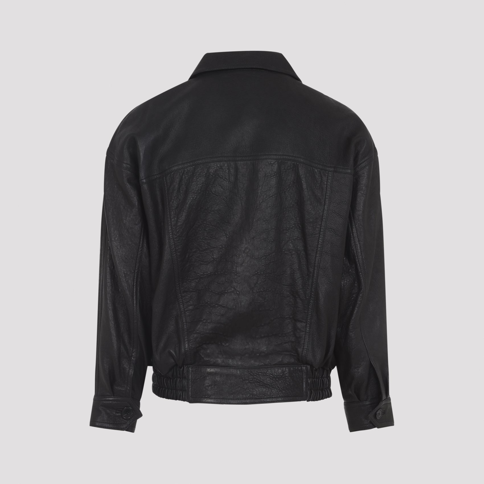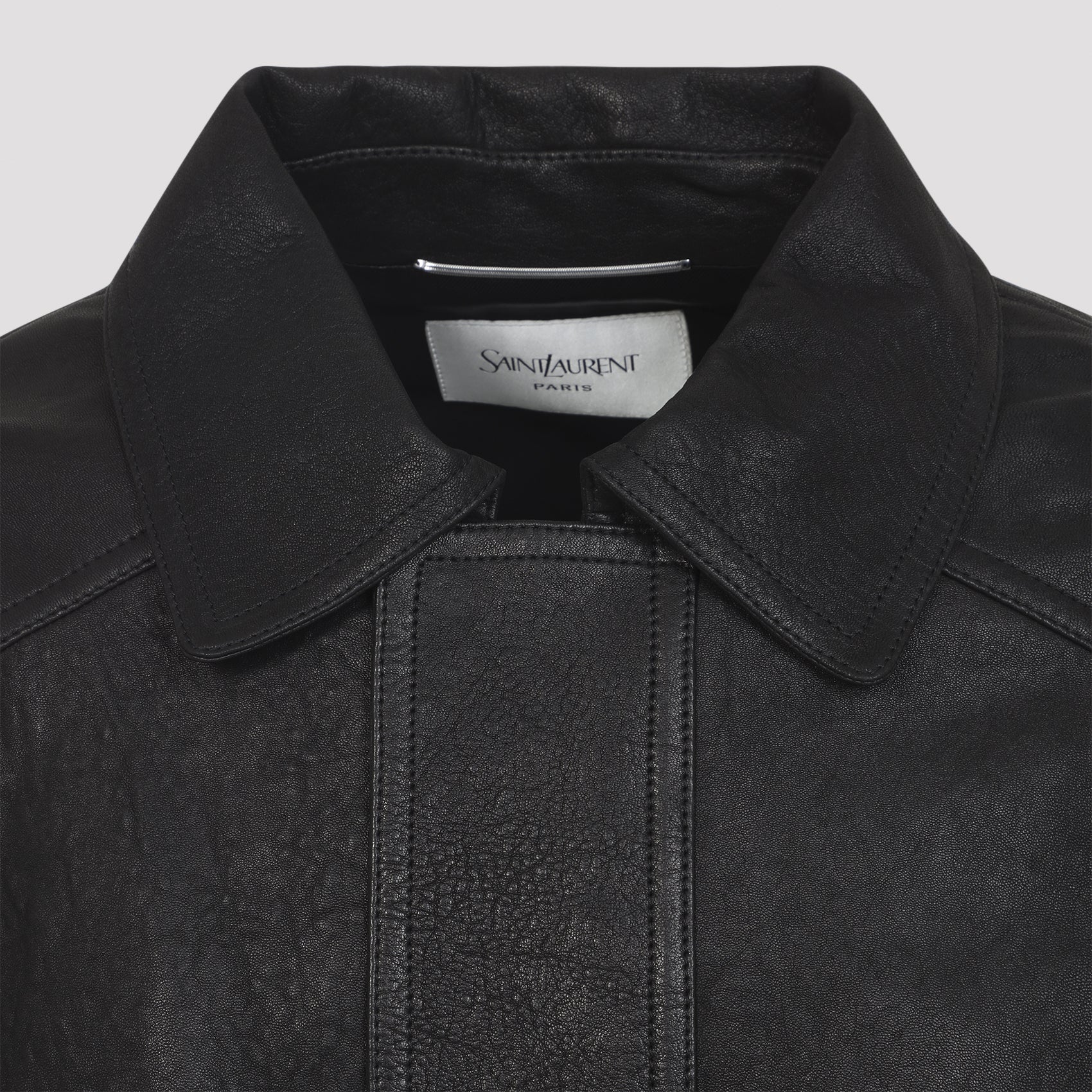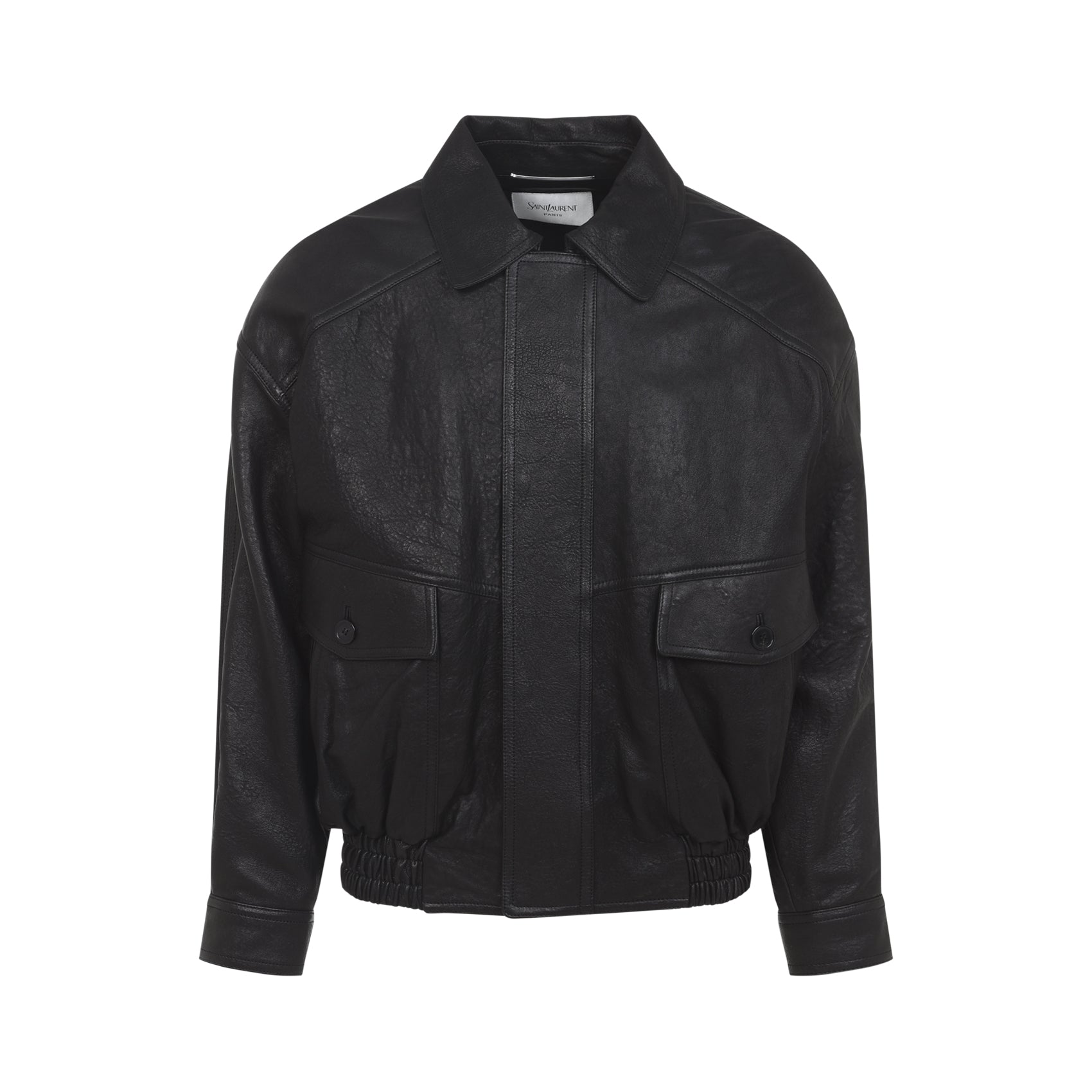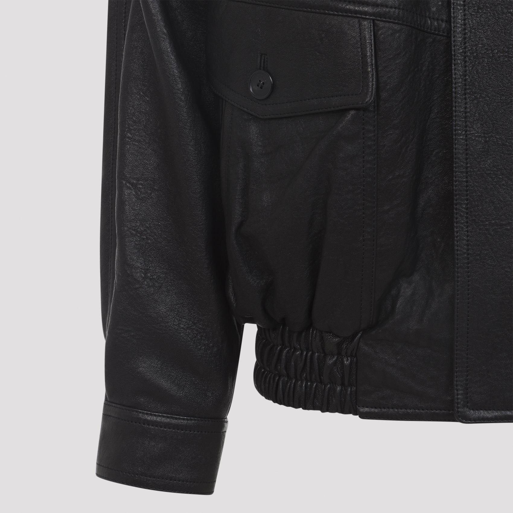 Saint Laurent Black Lamb Leather Blouson. Pure black lamb leather jacket, pointed collar, front concealing fastening, side flap buttoned pockets, dropped shoulders, long sleeves, buttoned cuffs, side elastic details on the hem, straight hem.