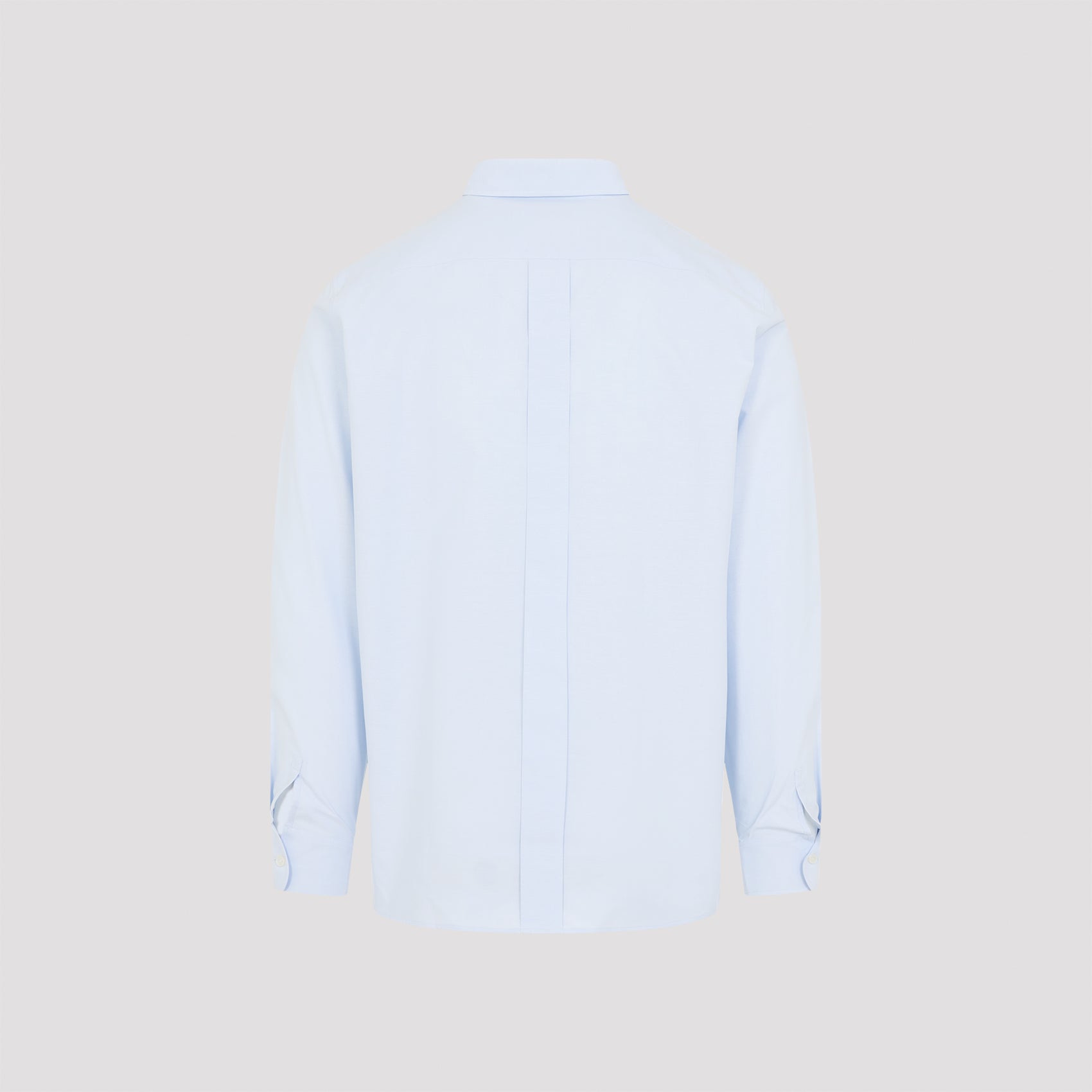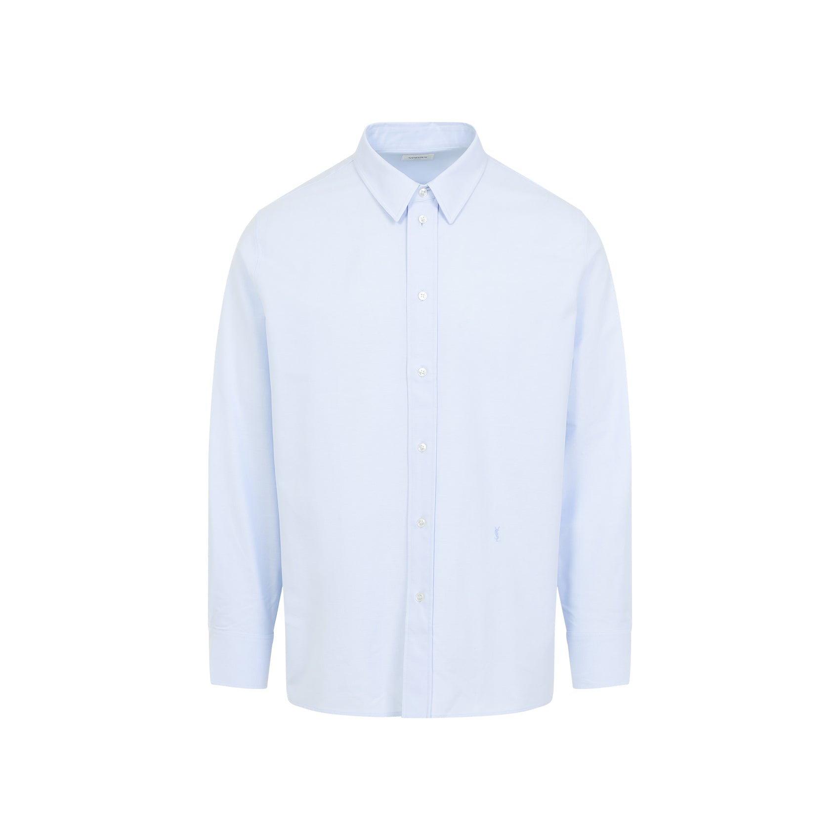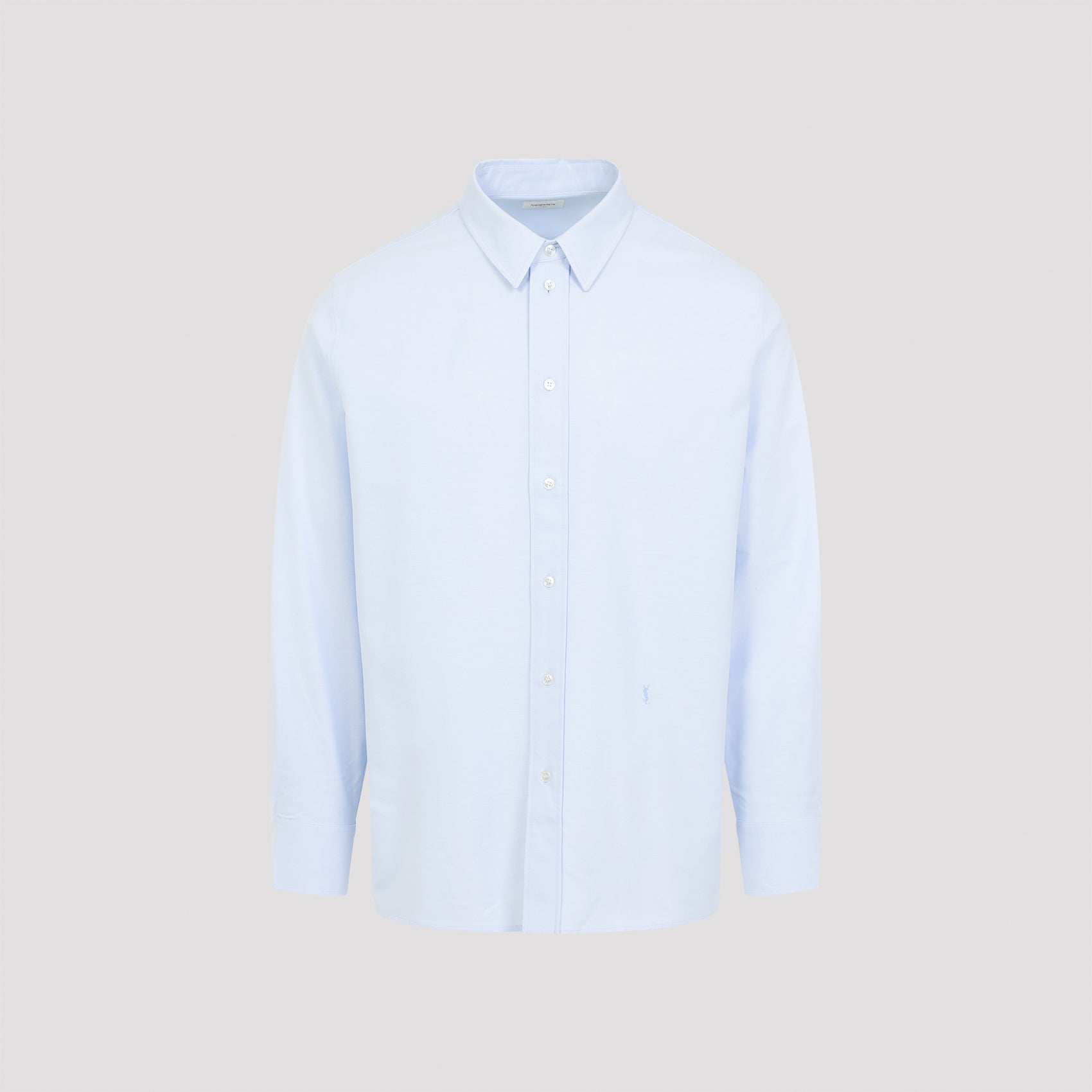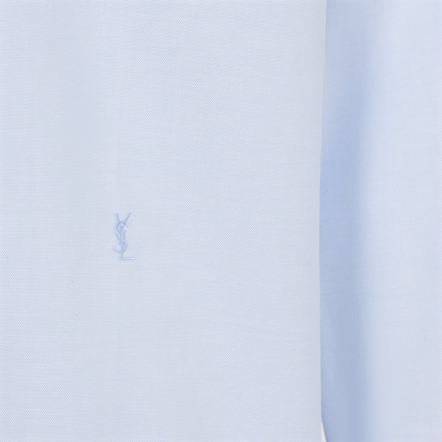 Saint Laurent Blue Cotton Shirt. Pure blue cotton shirt, pointed collar, front buttoned fastening, side tonal embroidered signature logo, long sleeves, buttoned cuffs, straight hem.