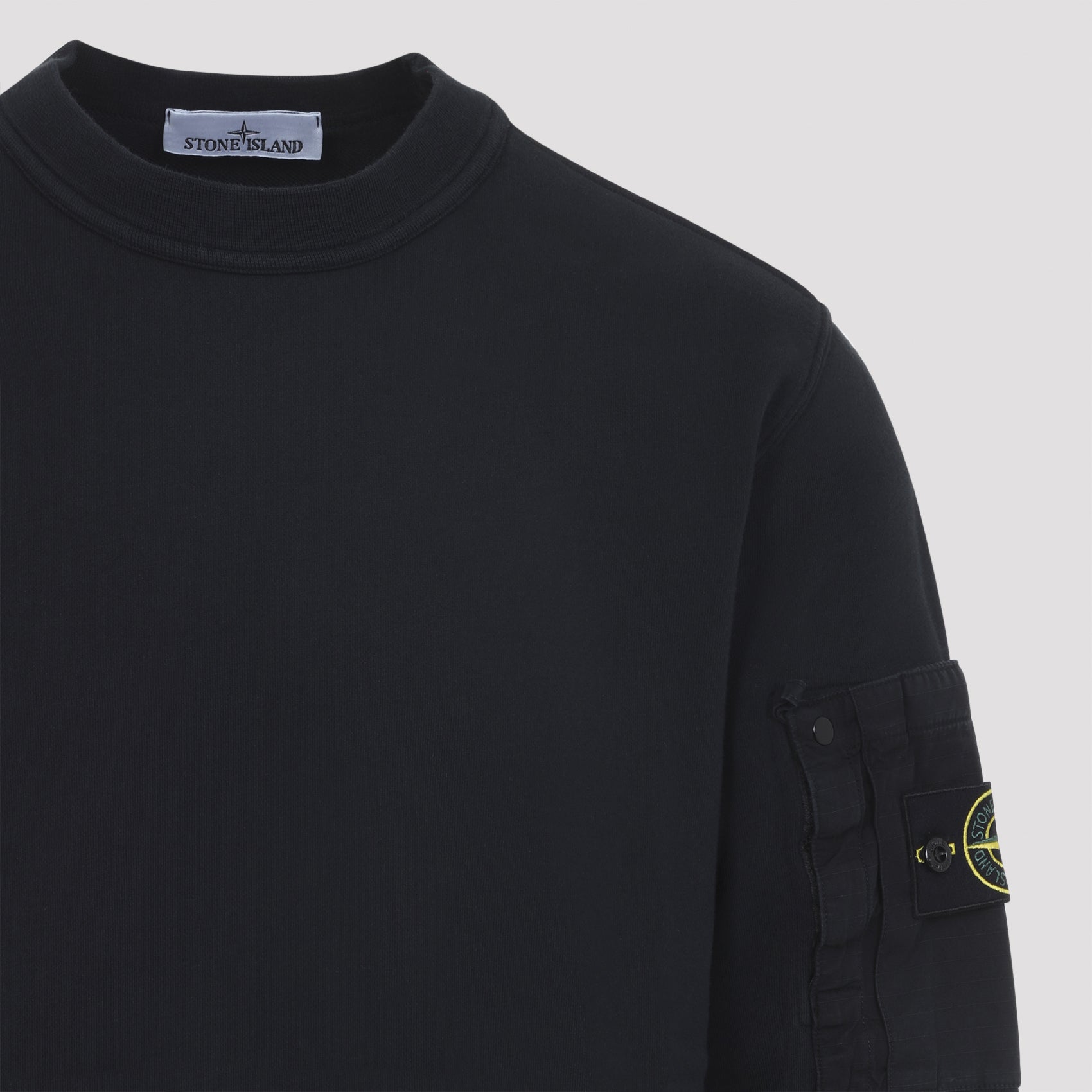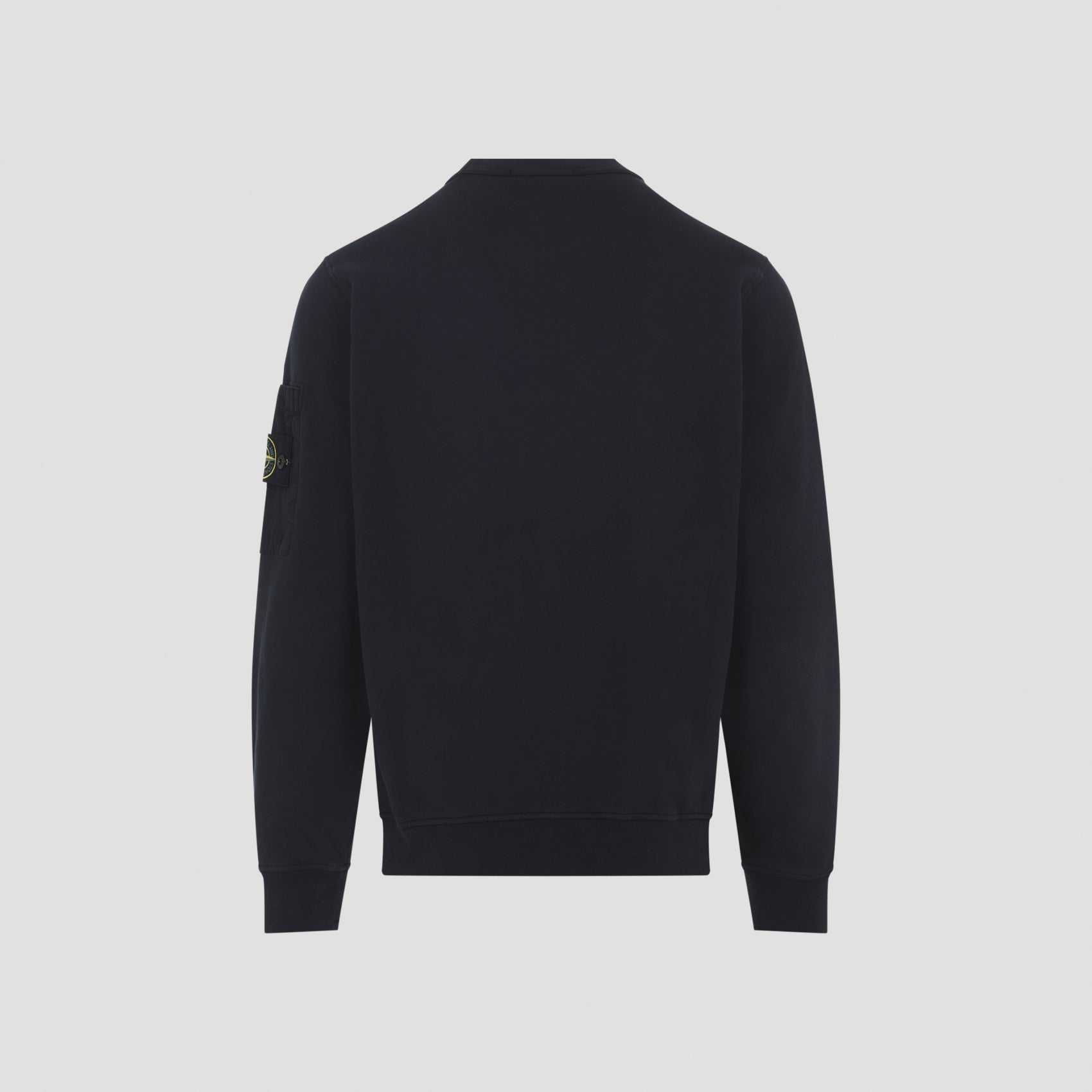 Stone Island Navy Blue Cotton Sweatshirt. Regular fit sweatshirt crafted from navy blue cotton, featuring a crewneck, long sleeves, the iconic pocket with logo patch on the sleeve, and ribbed hems.