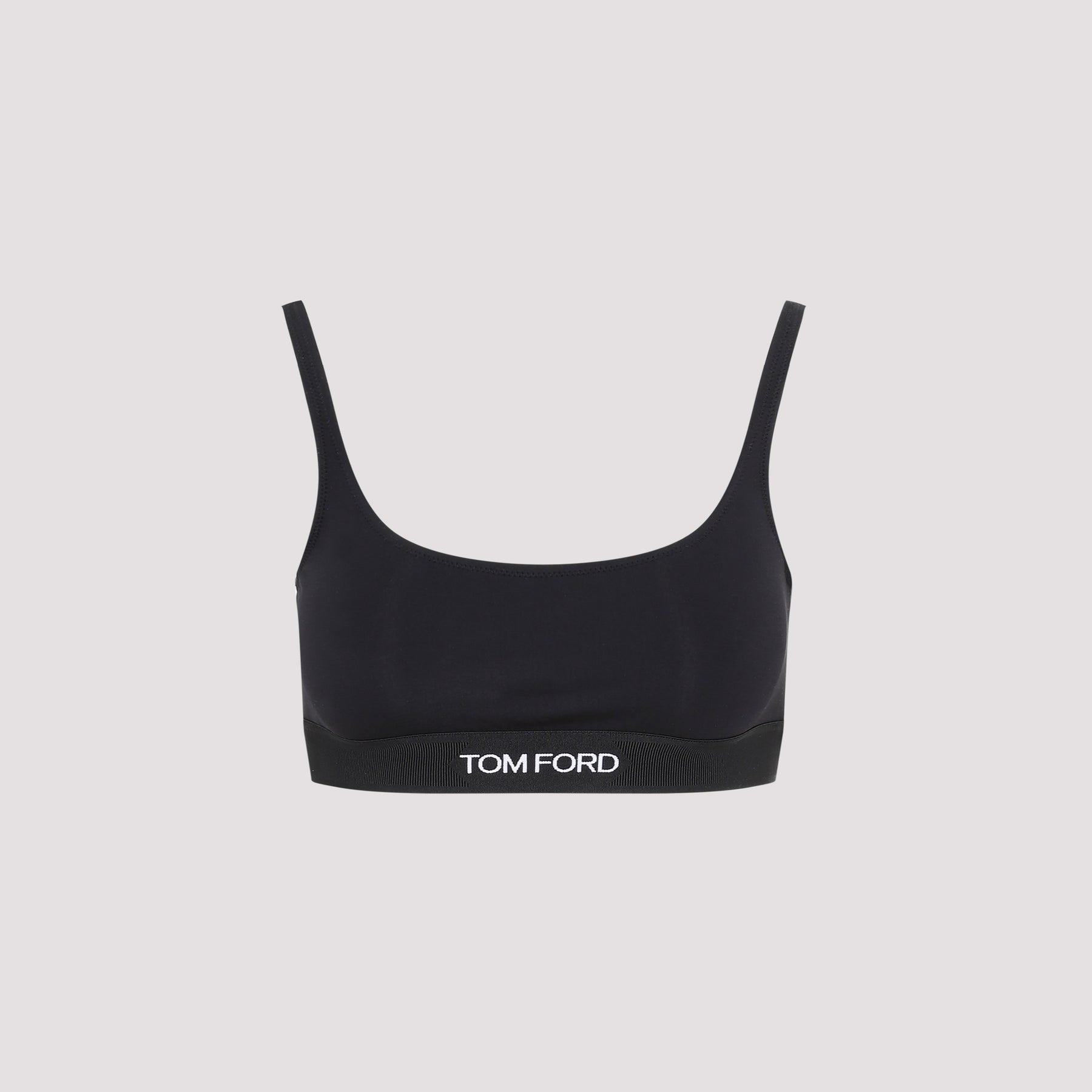 Tom Ford Black Modal Bra. Black modal blend, black elastic hem, logo details in white, attached shoulder straps, slip-on style.