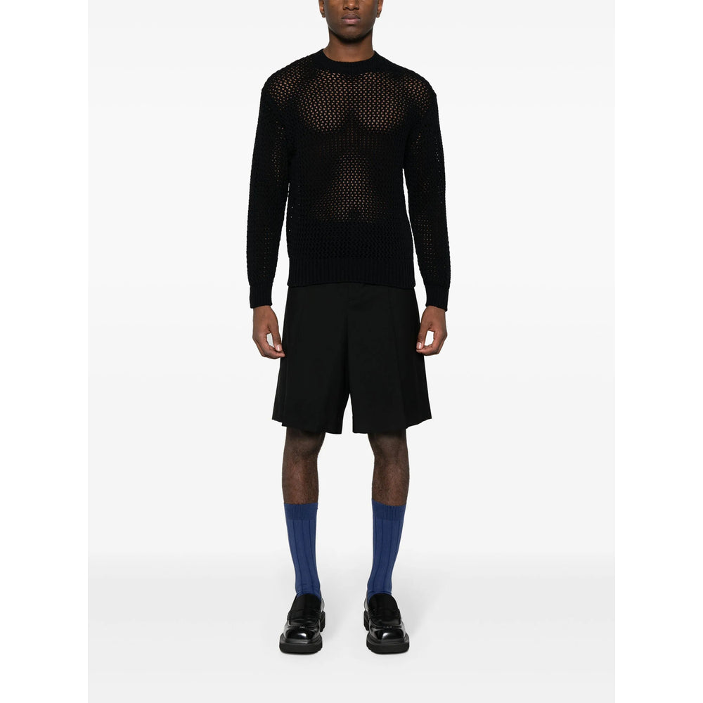 midnight blue cotton open knit semi-sheer construction crew neck long sleeves ribbed cuffs and hem straight hem