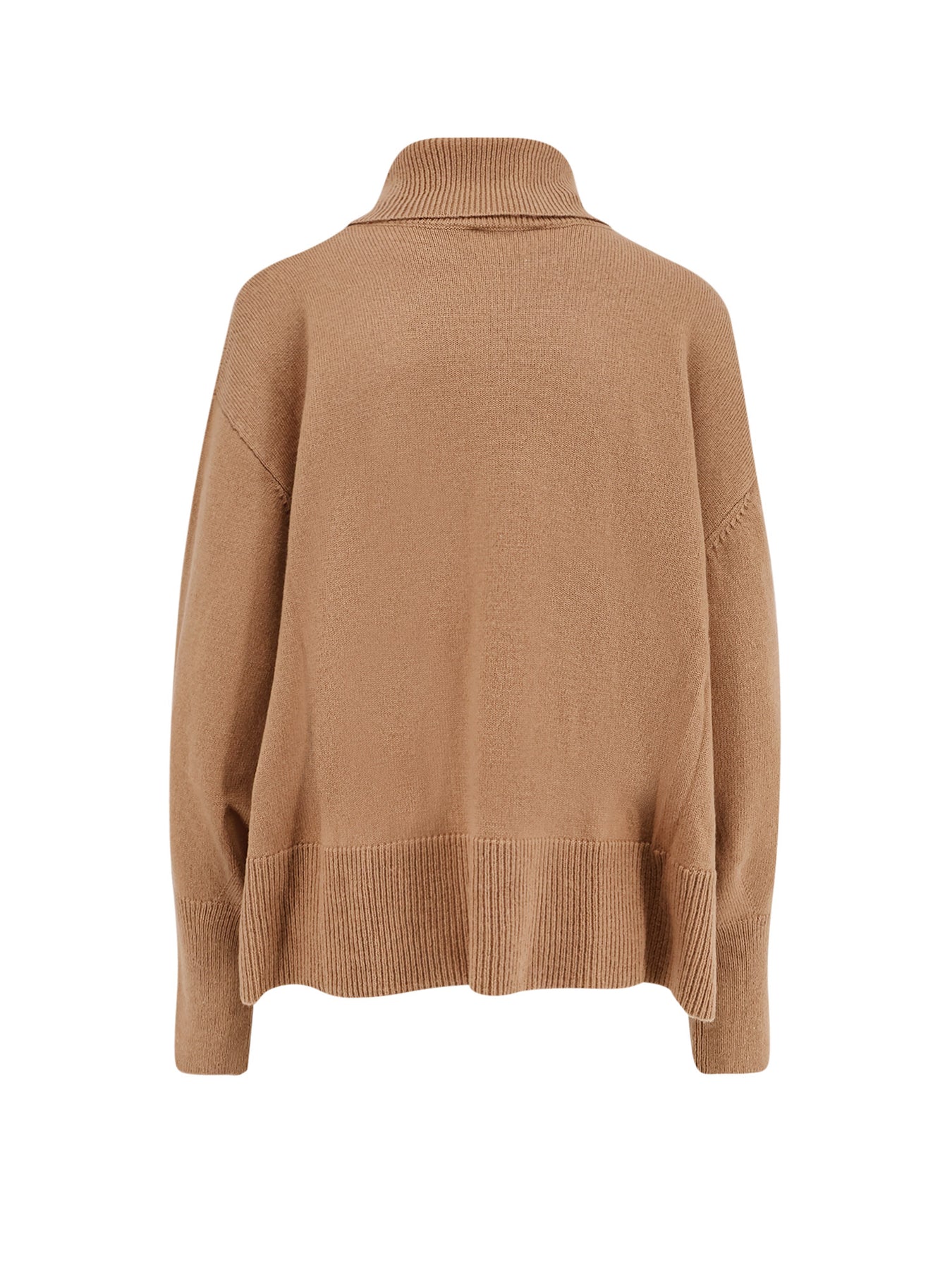 Logo embroidery on the collar Long sleeves with maxi cuffs Asymmetrical hem Side slits 50% polyamide 50% wool SKU: A3324002CAMEL