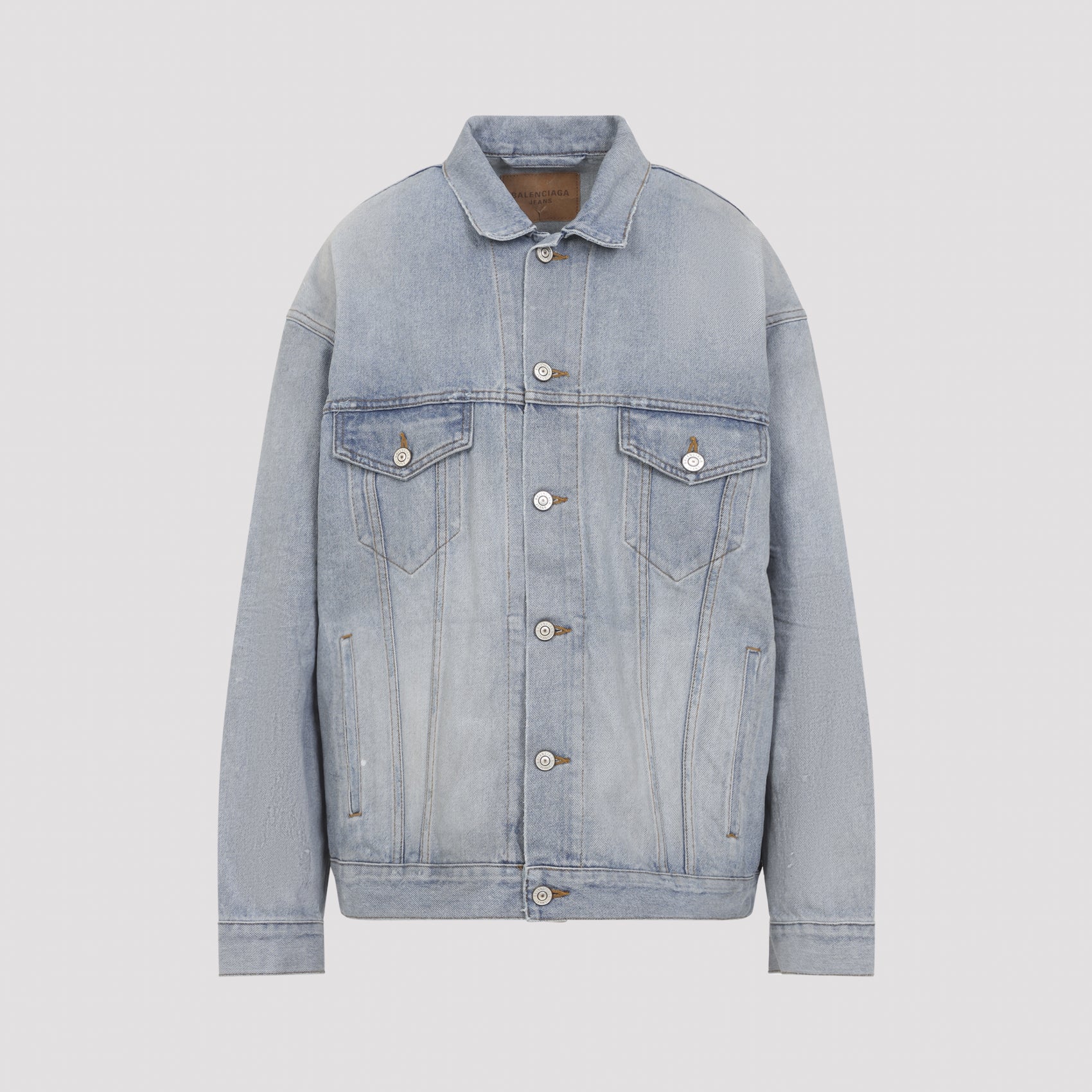 Balenciaga Dirty Light Blue Cotton Regular Jacket. Pure dirty light blue cotton jacket, pointed collar, front buttoned fastening, chest flap buttoned pockets, back white design with white lettering logo, dropped shoulders, long sleeves, buttoned cuffs, straight hem.