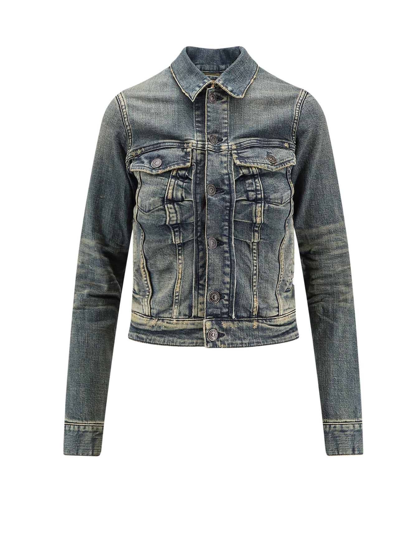 Button closure Four front pockets Pointed collar Used-effect Rouche profile Made in Italy 100% cotton SKU: 849899TTW893394
