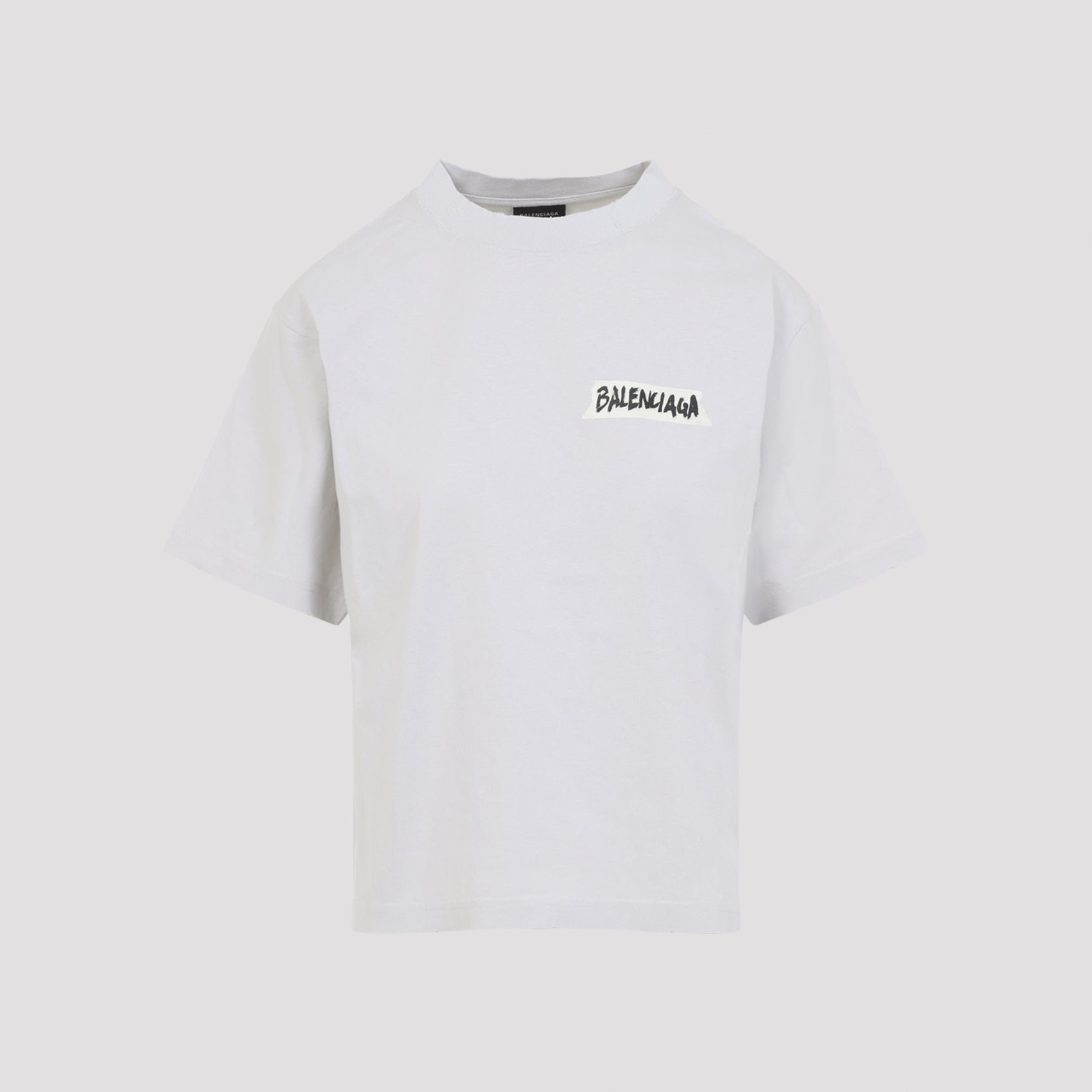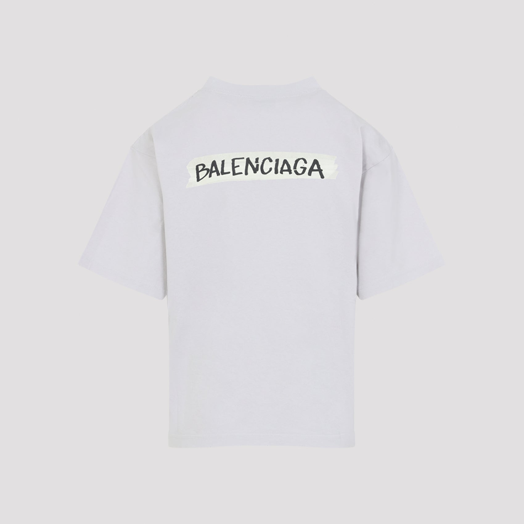 Balenciaga Dirty White Cotton Medium Fit T-Shirt. Pure dirty white t-shirt, round neck, chest white design with black lettering logo, back white design with black lettering logo, short sleeves, straight hem.