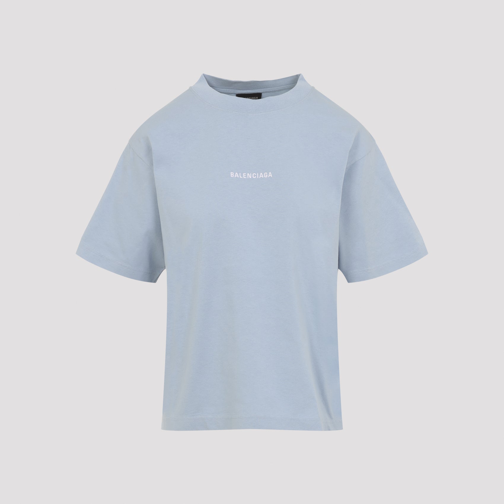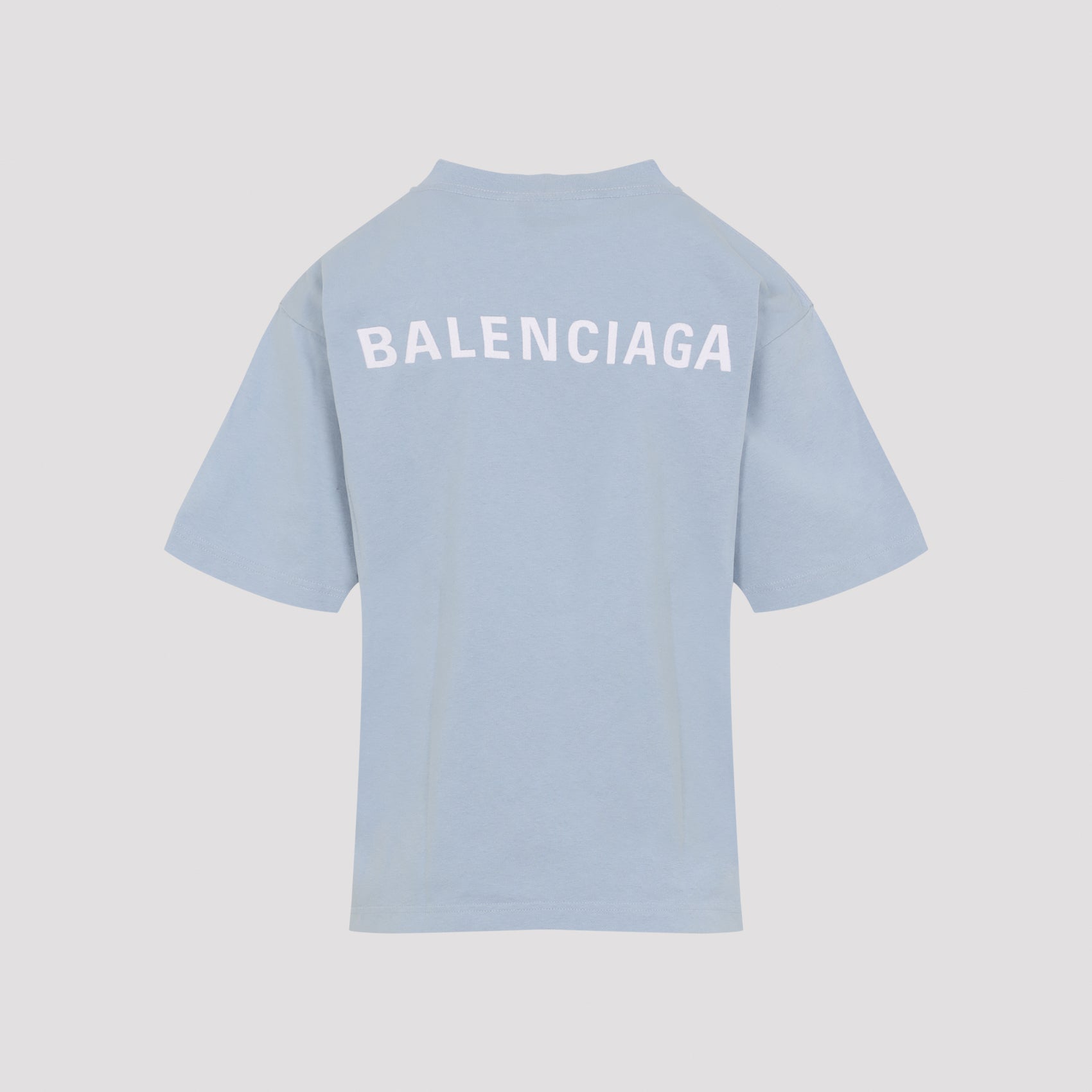 Balenciaga Medium Fit Light blue Cotton T-shirt. Crafted from light blue cotton jersey, round ribbed neckline, pink logo on the chest and back, short sleeves, straight hem.