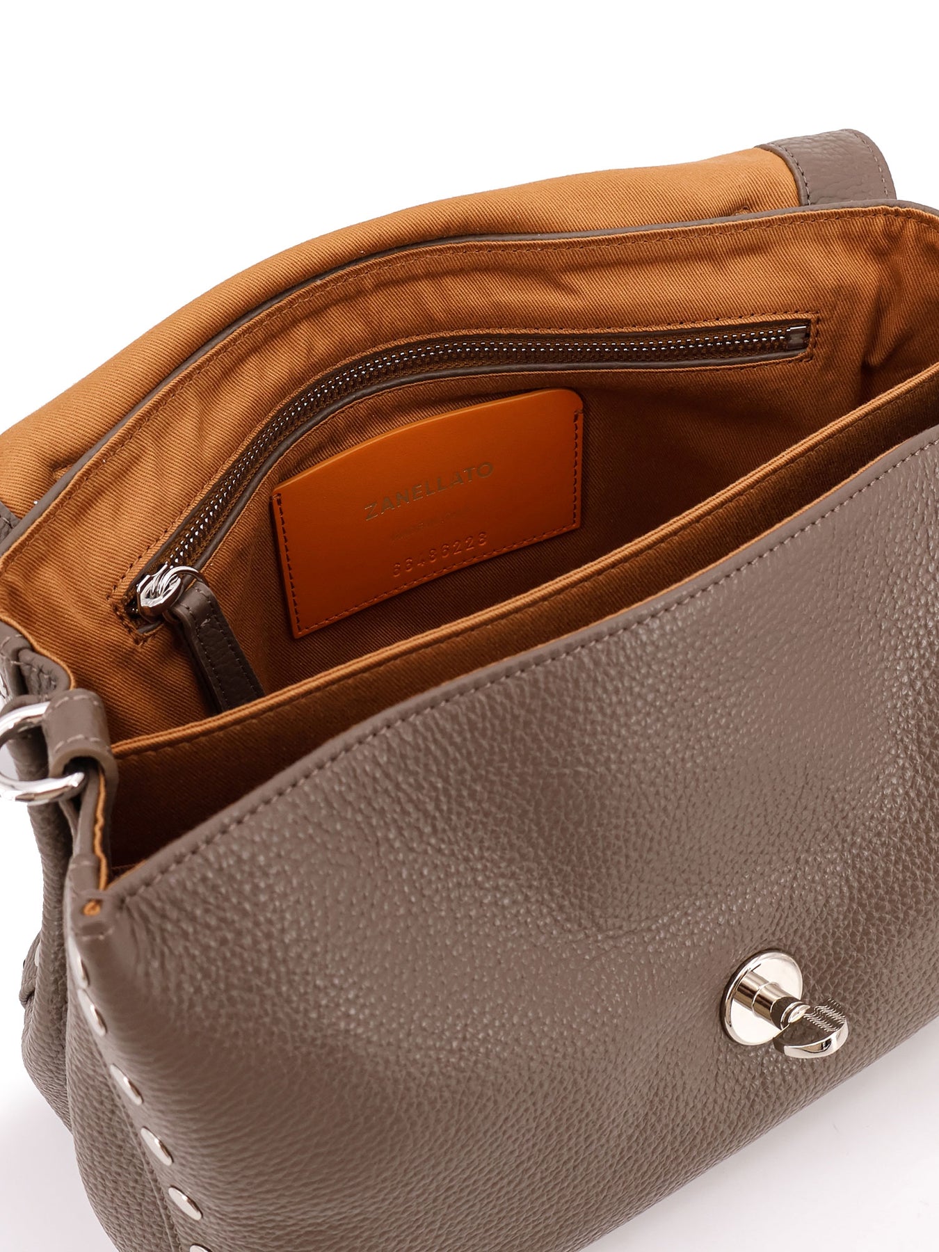 Leather handle Removable and adjustable leather shoulder strap Flap closure with metal turn lock Double internal compartment and internal zip pocket Iconic metal studs Made in Italy Leather W: 30cm x H: 18cm x D: 15cm SKU: 0680100040000SZ0183