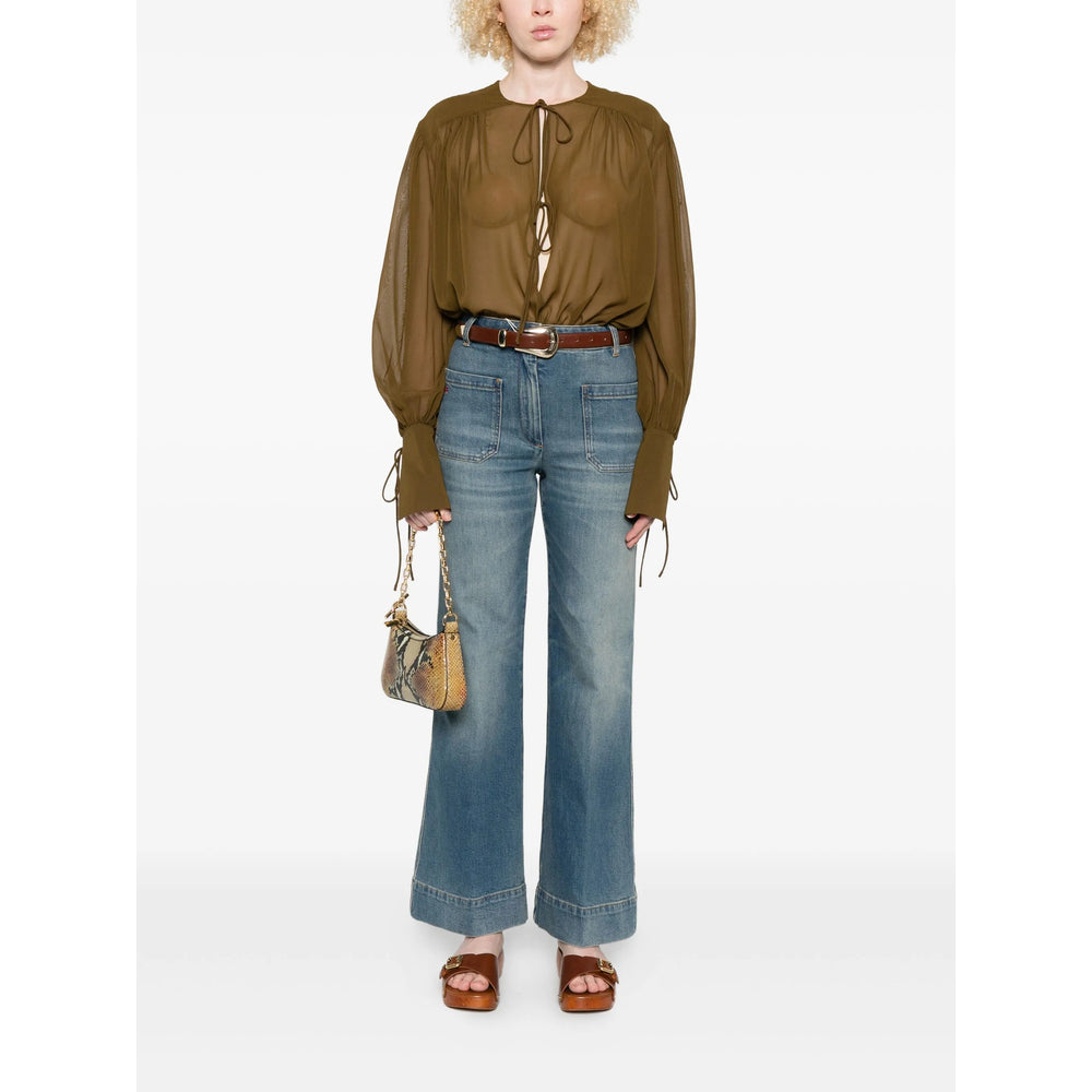 brown self-tie neck gathered details long sleeves cuffed sleeves