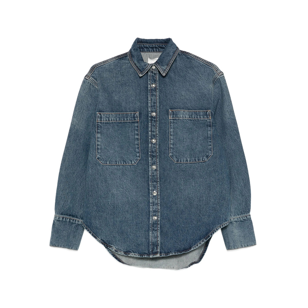 indigo blue front button fastening long sleeves buttoned cuffs two chest patch pockets curved hem