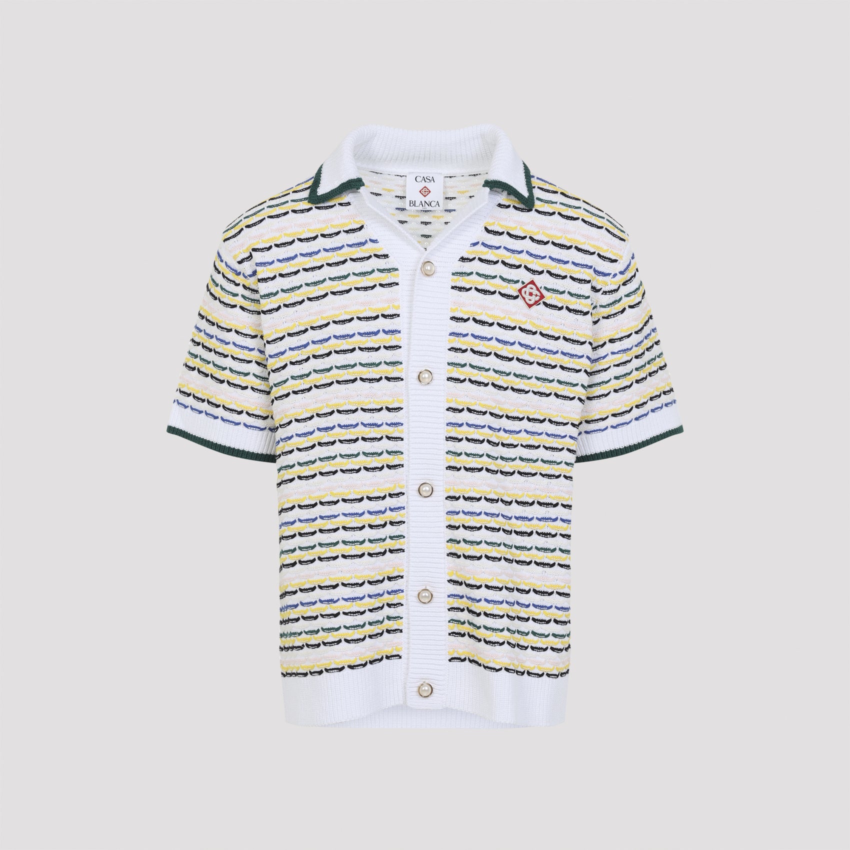 Casablanca Tuck Stitch Multicolor Cotton Shirt. Crocheted white cotton shirt, it features yellow and green embroidery all over, a pointed collar, front button fastening, logo patch on the chest, short sleeves, and a straight hem.