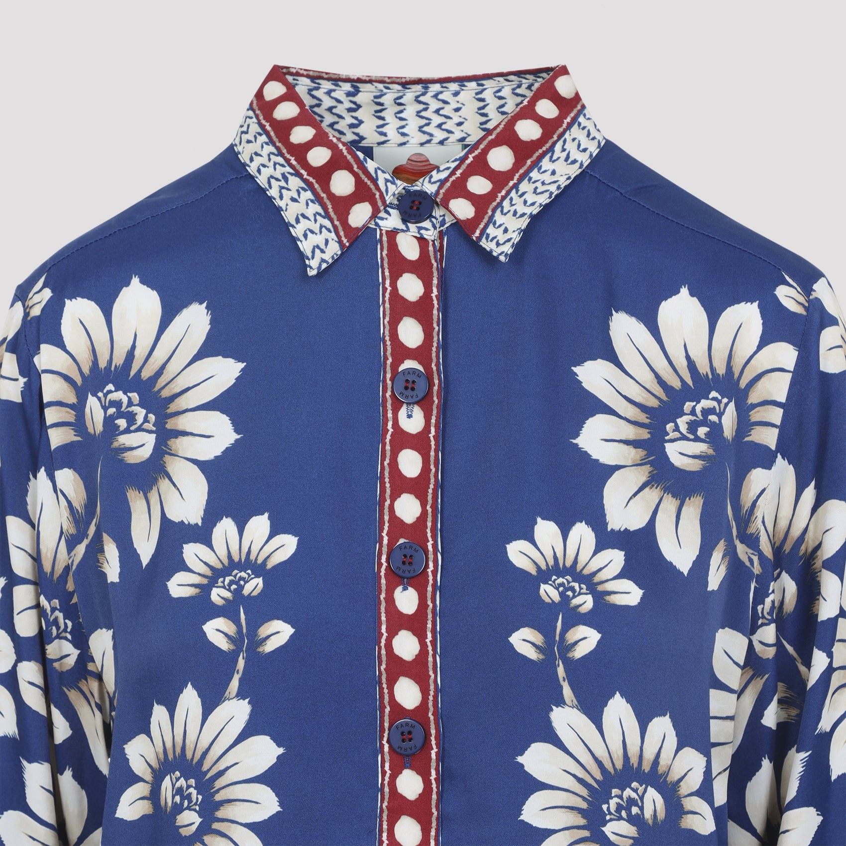 Farm Rio Luna Blue Viscose Shirt. Crafted from blue viscose, it features an all-over floral print with contrasting red and white geometric details, a pointed collar, front button fastening, long sleeves with buttoned cuffs, a back yoke, and a straight hem.