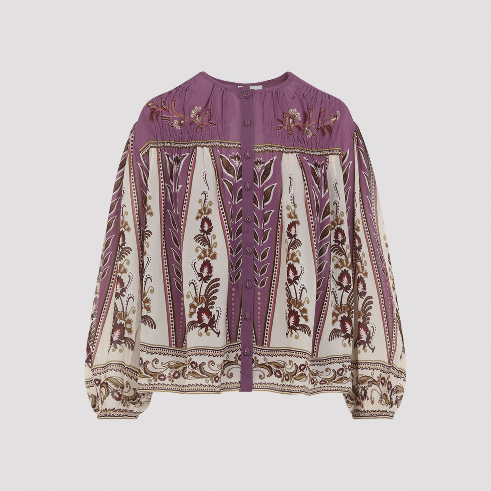 Farm Rio Ainika Delicate Sand Viscose Blouse. Farm Rio Ainika Delicate Sand Viscose Shirts. Crafted from sand and dark pink viscose, featuring an all over floral print, a round neckline, top gathered details, front button fastening, long balloon sleeves, and a flared hem.