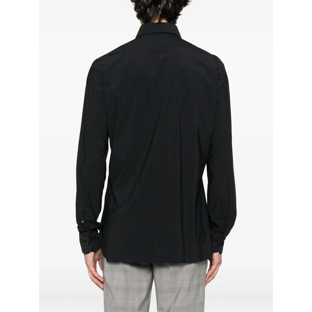 black button fastening point collar long sleeves curved hem