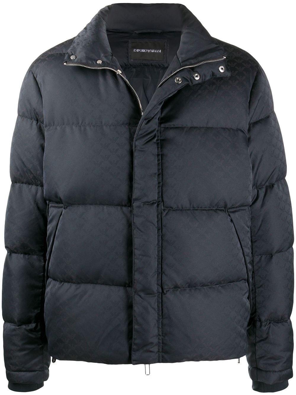 Dark blue puffer down jacket from EMPORIO ARMANI featuring padded design, front zip fastening, front press-stud fastening, long sleeves and two side slit pockets.