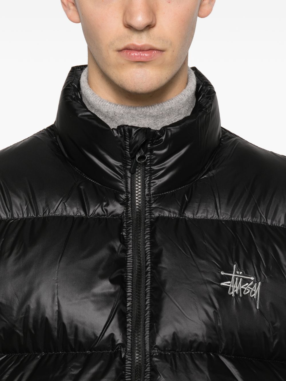 black zip fastening logo detail high neck long sleeves quilted design