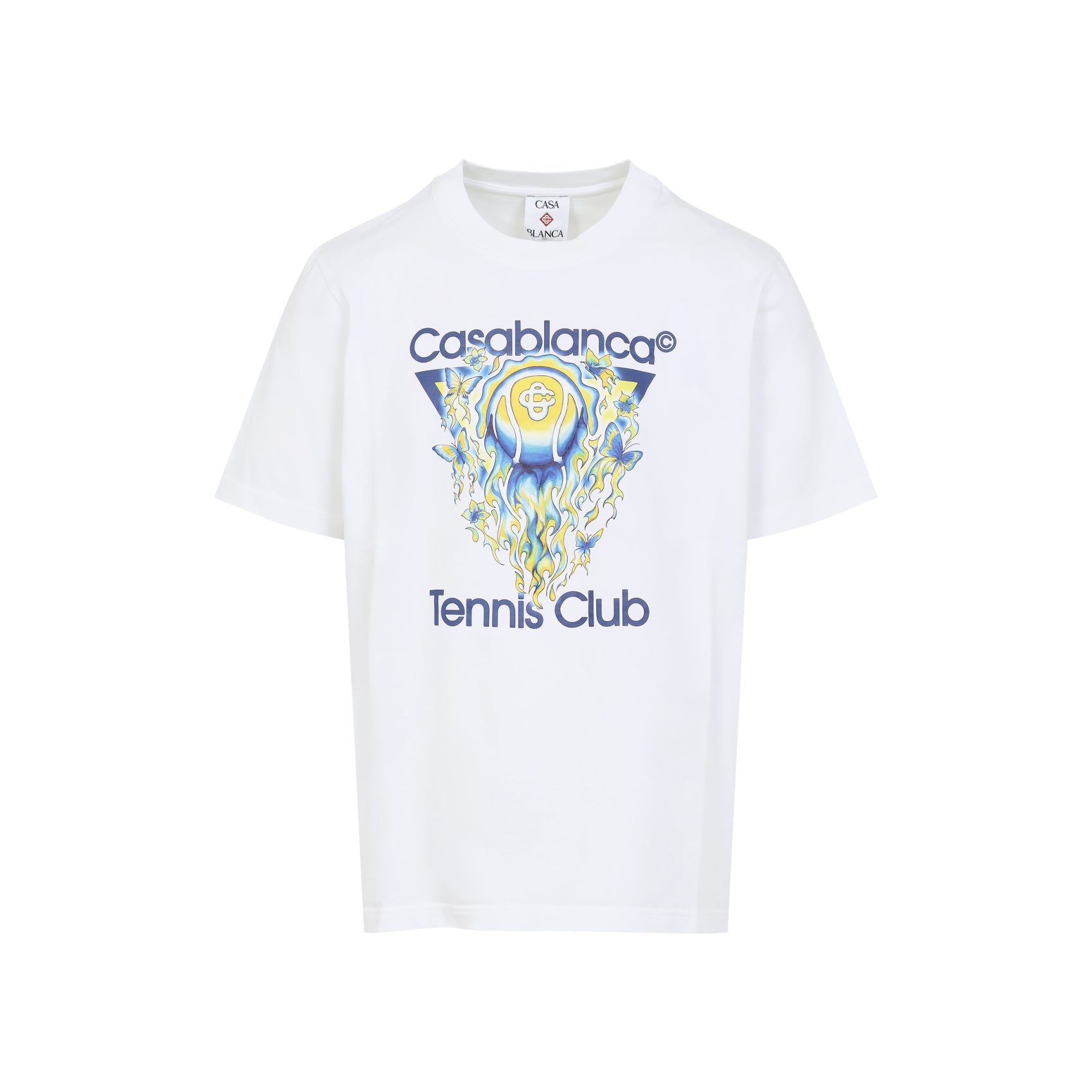 Casablanca Tennis Club Icon White Cotton T-shirt. Crafted from white organic cotton, it features a round ribbed neckline, logo and Tennis Club graphic print on the front, short sleeves, and a straight hem.
