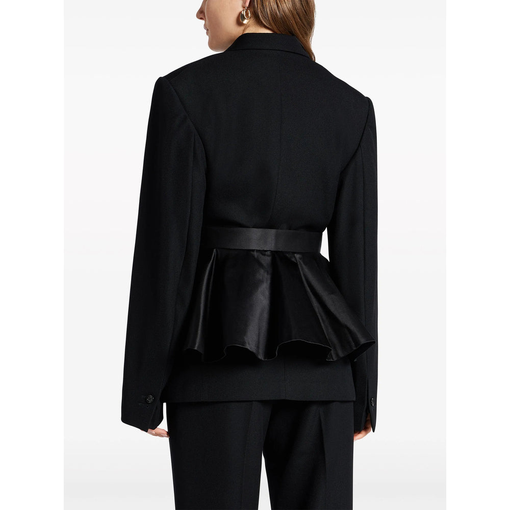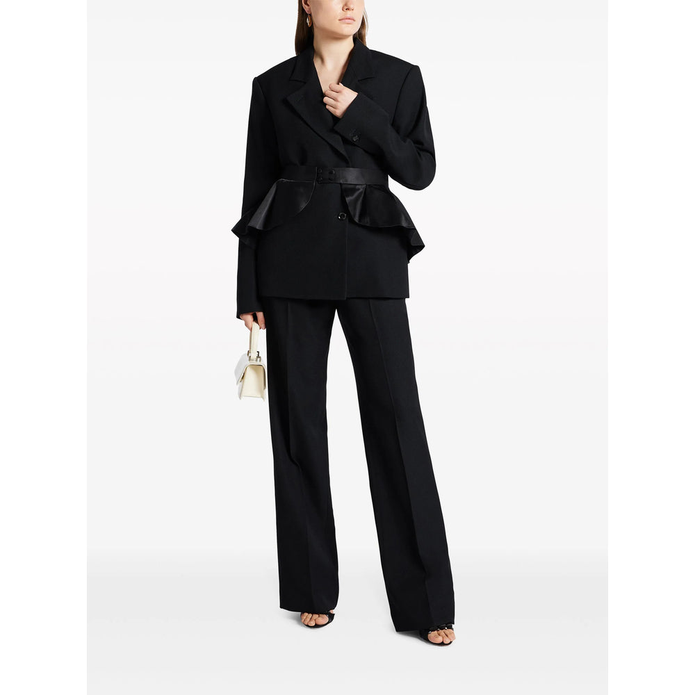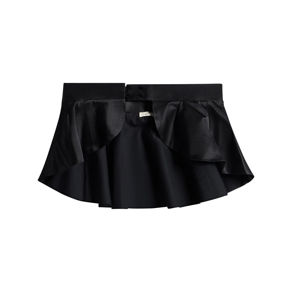 black organic cotton blend satin finish ruffled detailing front button fastening flared hem adjustable fit