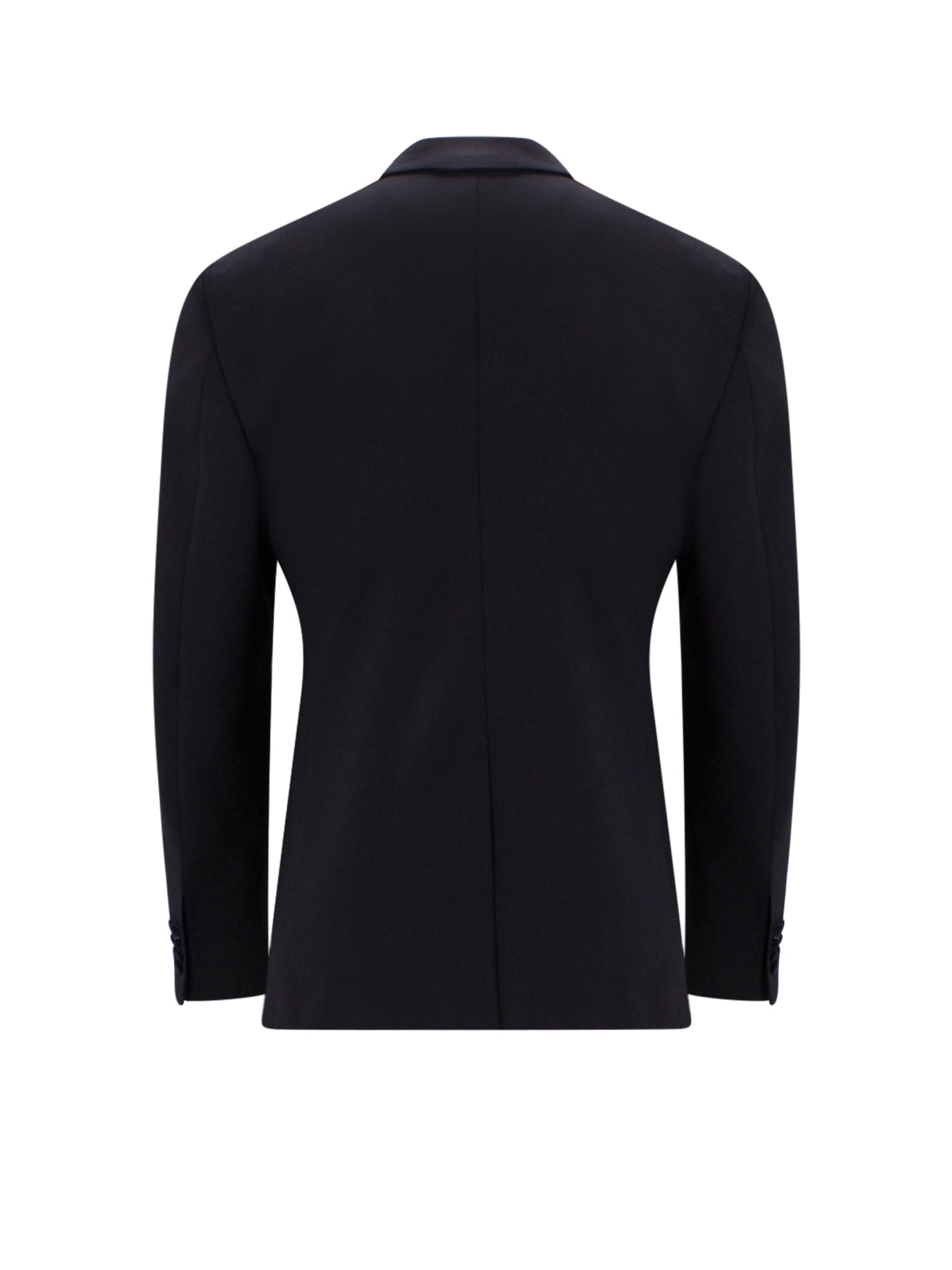 SKU: G2PQ4TGG150_N0000 - Satin peak lapel closure with two covered buttons pockets with flap on the front made in italy 82% wool 12% silk 3% elastane 3% polyester