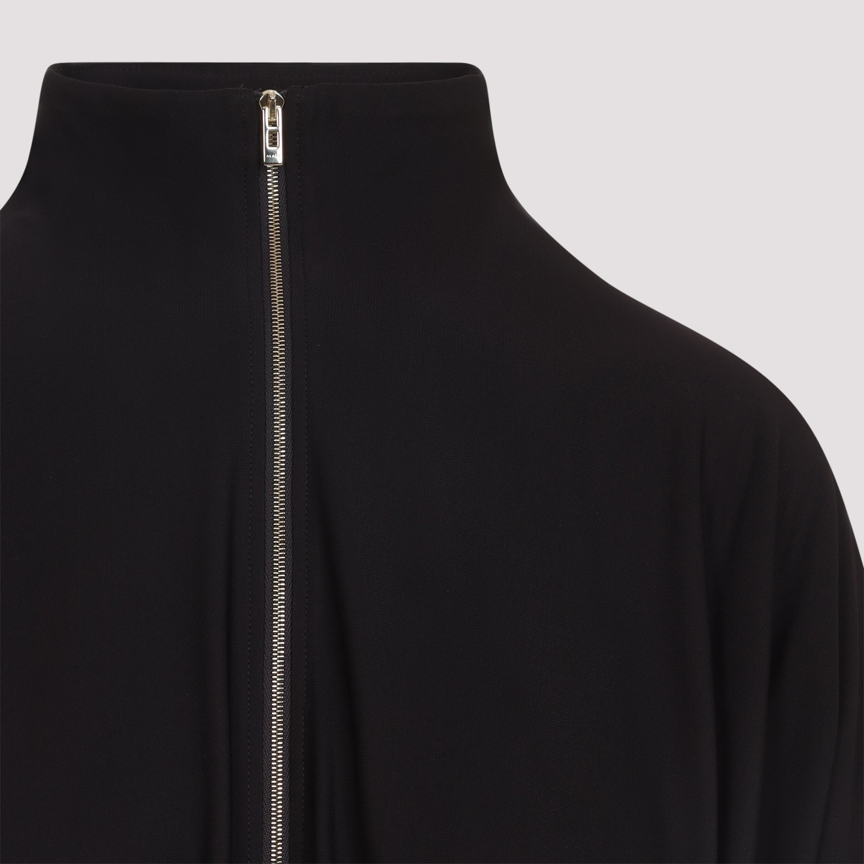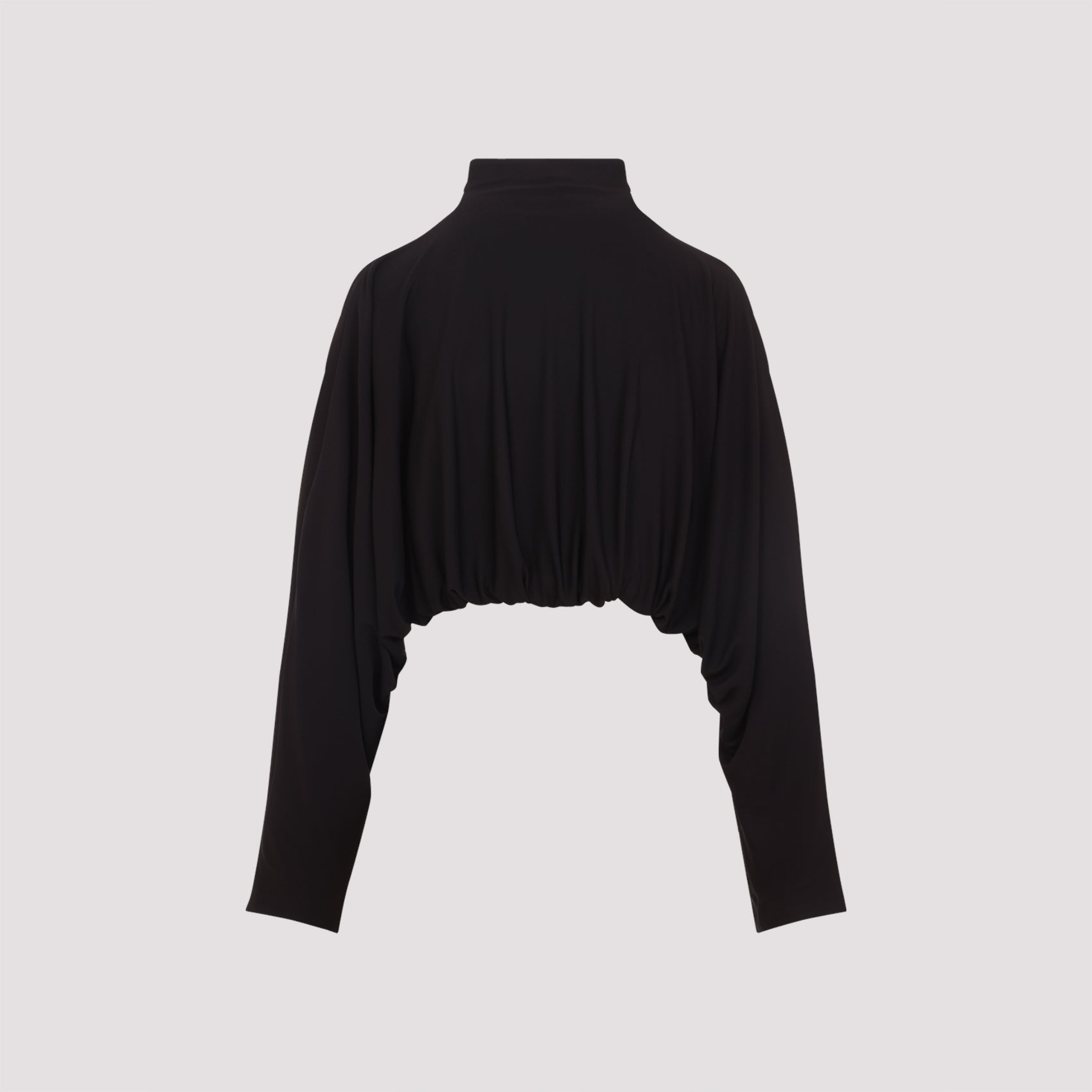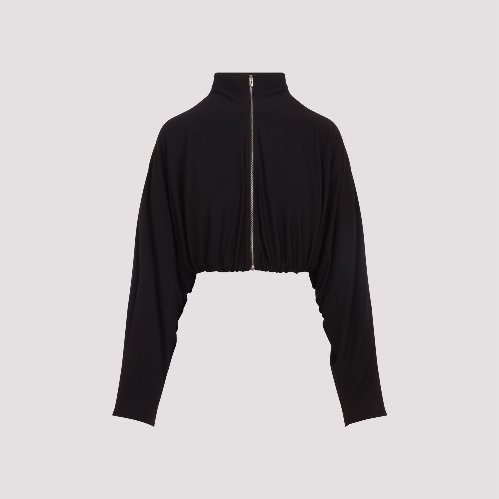 Alaïa Draped Black Viscose Jacket. Cropped jacket crafted from black viscose-blend jersey, featuring a draped construction, a stand collar, a front zip fastening, and long sleeves.
