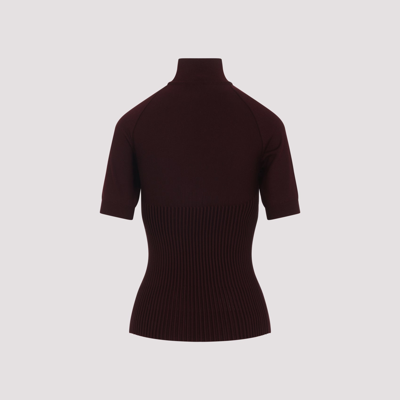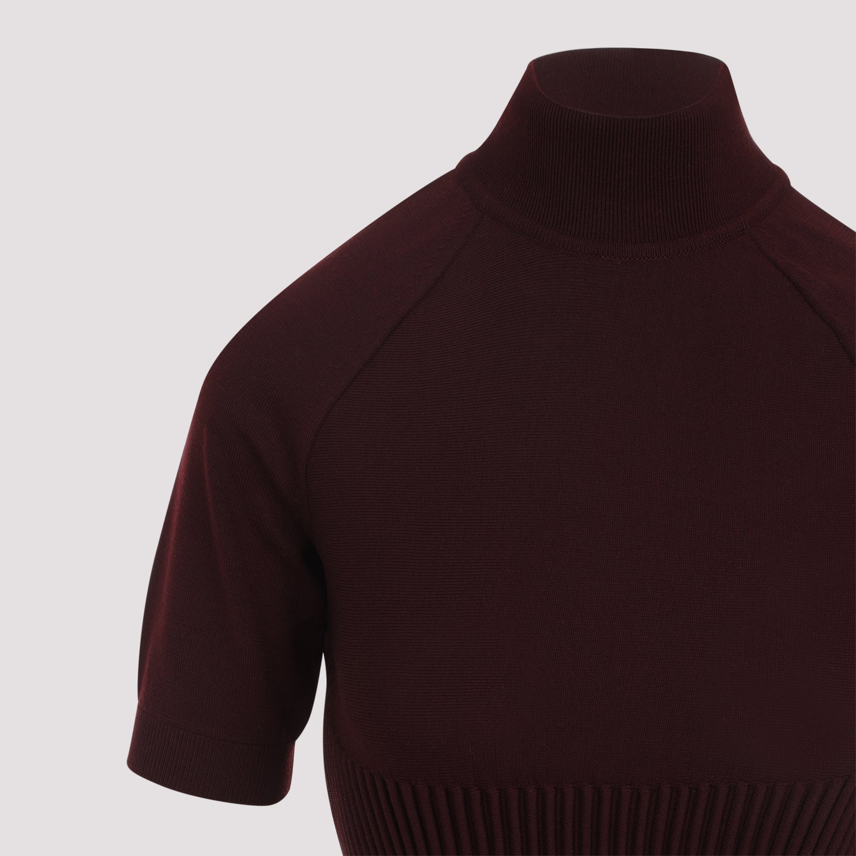 Alaïa Rib Burgundy Wool Top. Short raglan-sleeve top crafted from burgundy wool, featuring a standing collar, a ribbed bodice, and a straight hem.
