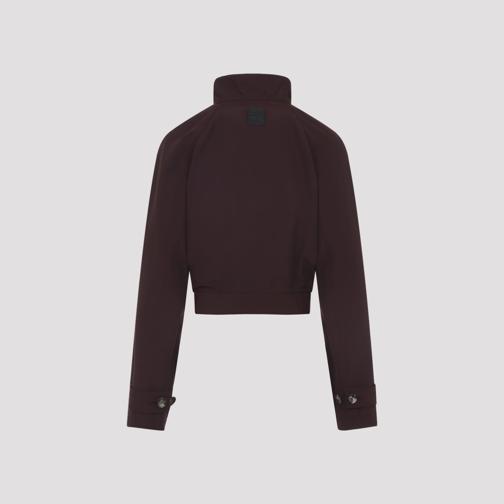 Loewe Short Burgundy Cotton Trench. Short jacket crafted from burgundy cotton-blend twill, featuring a high collar, concealed button fastening, long raglan sleeves with belted cuffs, a tonal waist belt with a metal buckle, a branded leather label at the back of the collar, and a boxy fit.