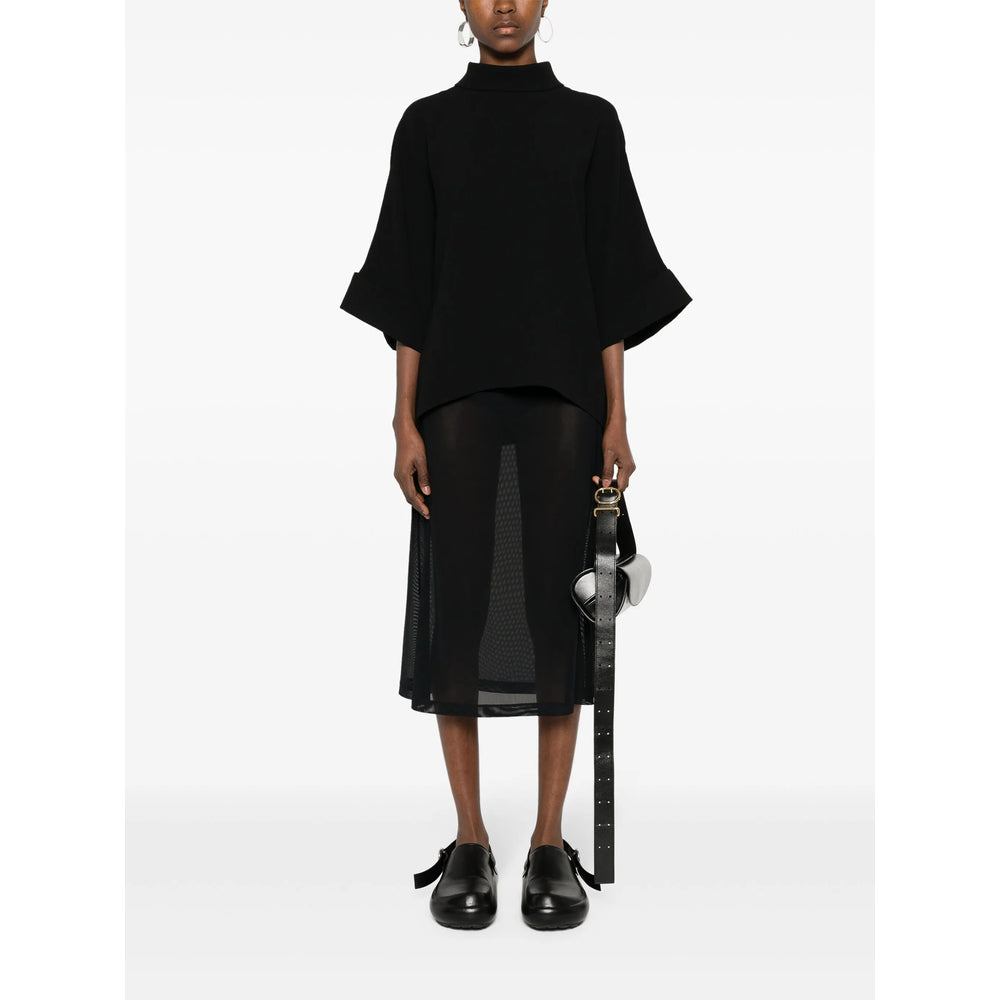 black crepe texture fabric-covered buttons spread collar V-neck/keyhole neck short sleeves turn-up cuffs front slit front single button fastening high-low hem unlined