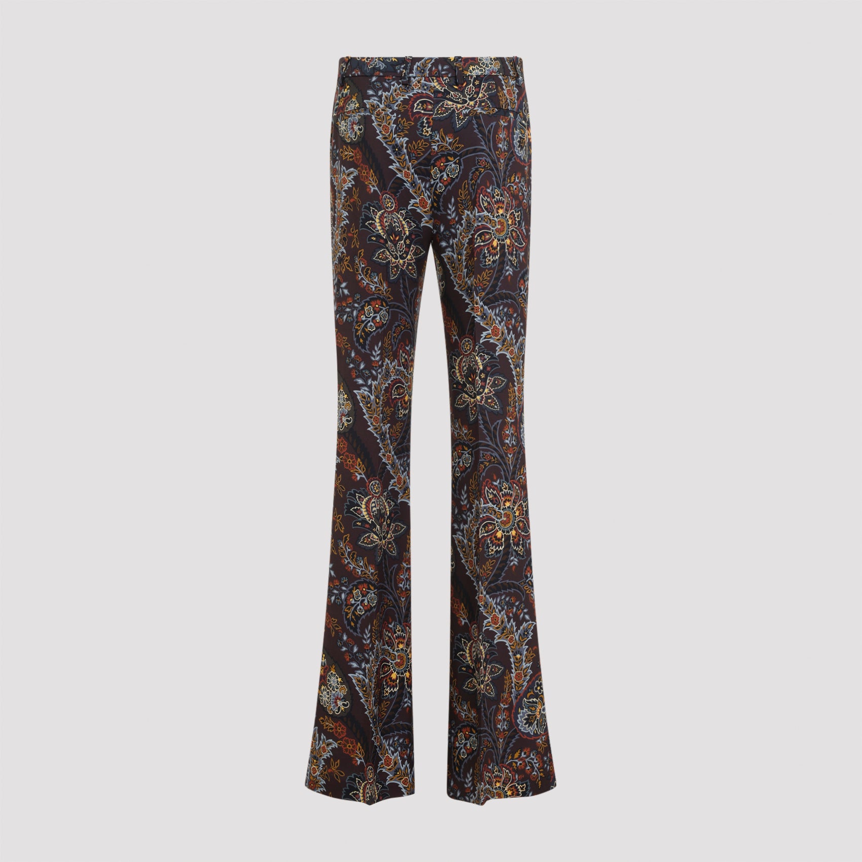 Etro Cady Printed Blue Black Viscose Pants. Crafted from blue black stretch viscose cady, floral Paisley pattern all over, high-waist, belt loops, hook and zip closure, central pressed creases, back welt pockets, flared hem, slim fit.