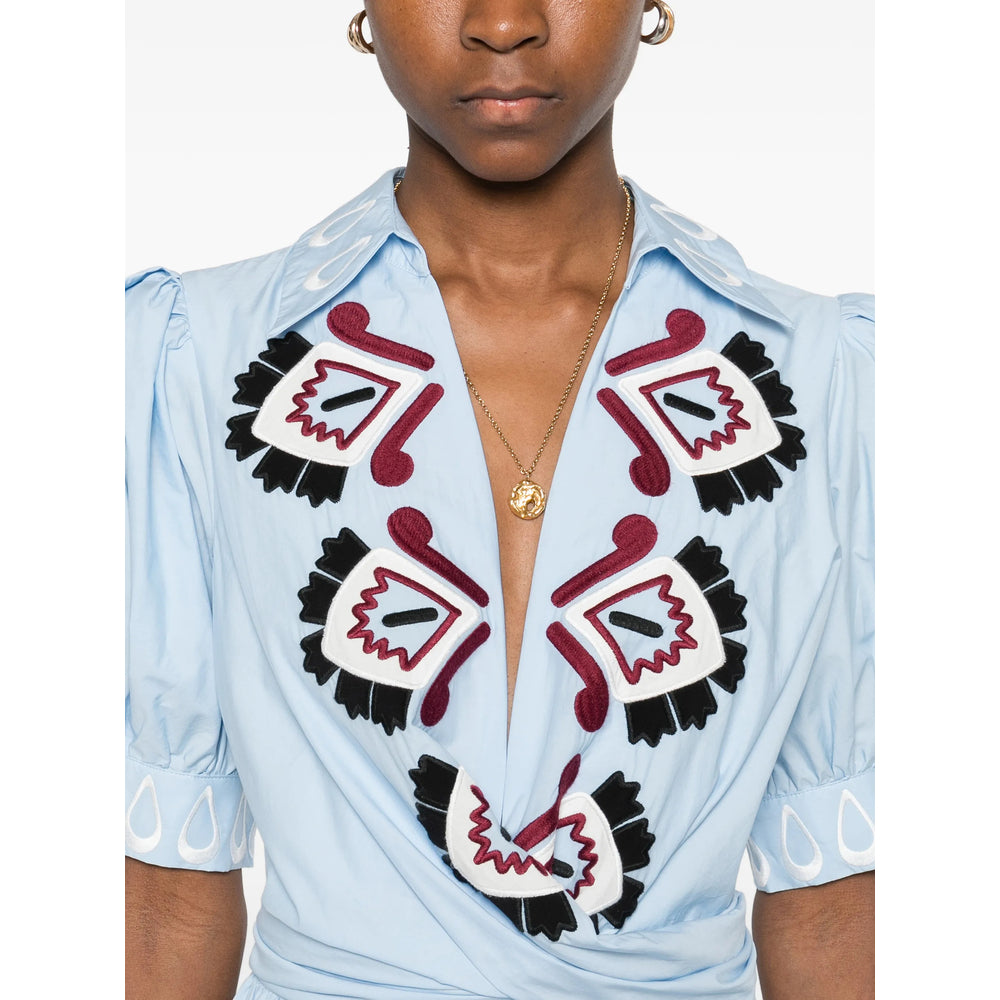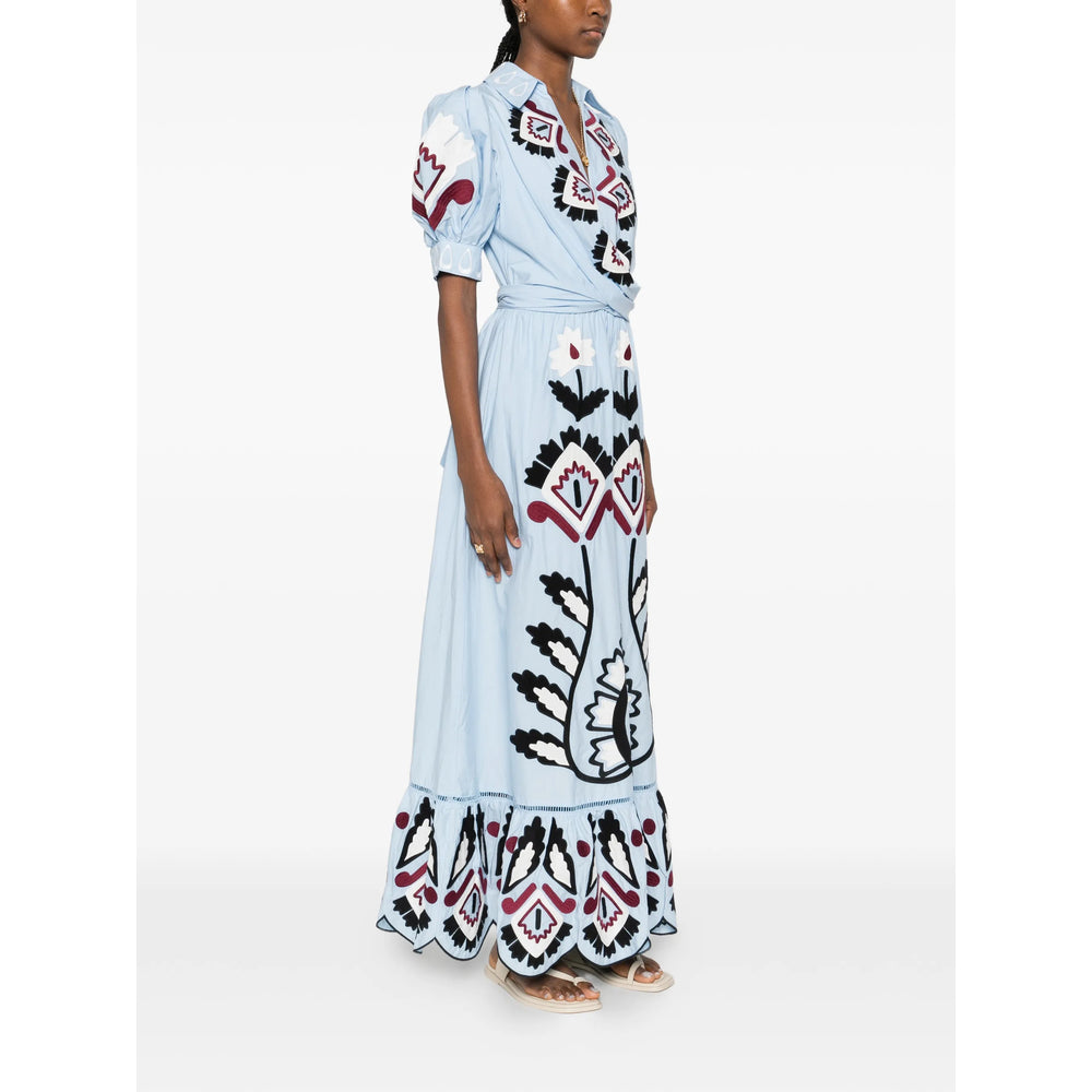 light blue embroidered detailing puff sleeves ruffled hem V-neck front self-tie fastening side zip fastening