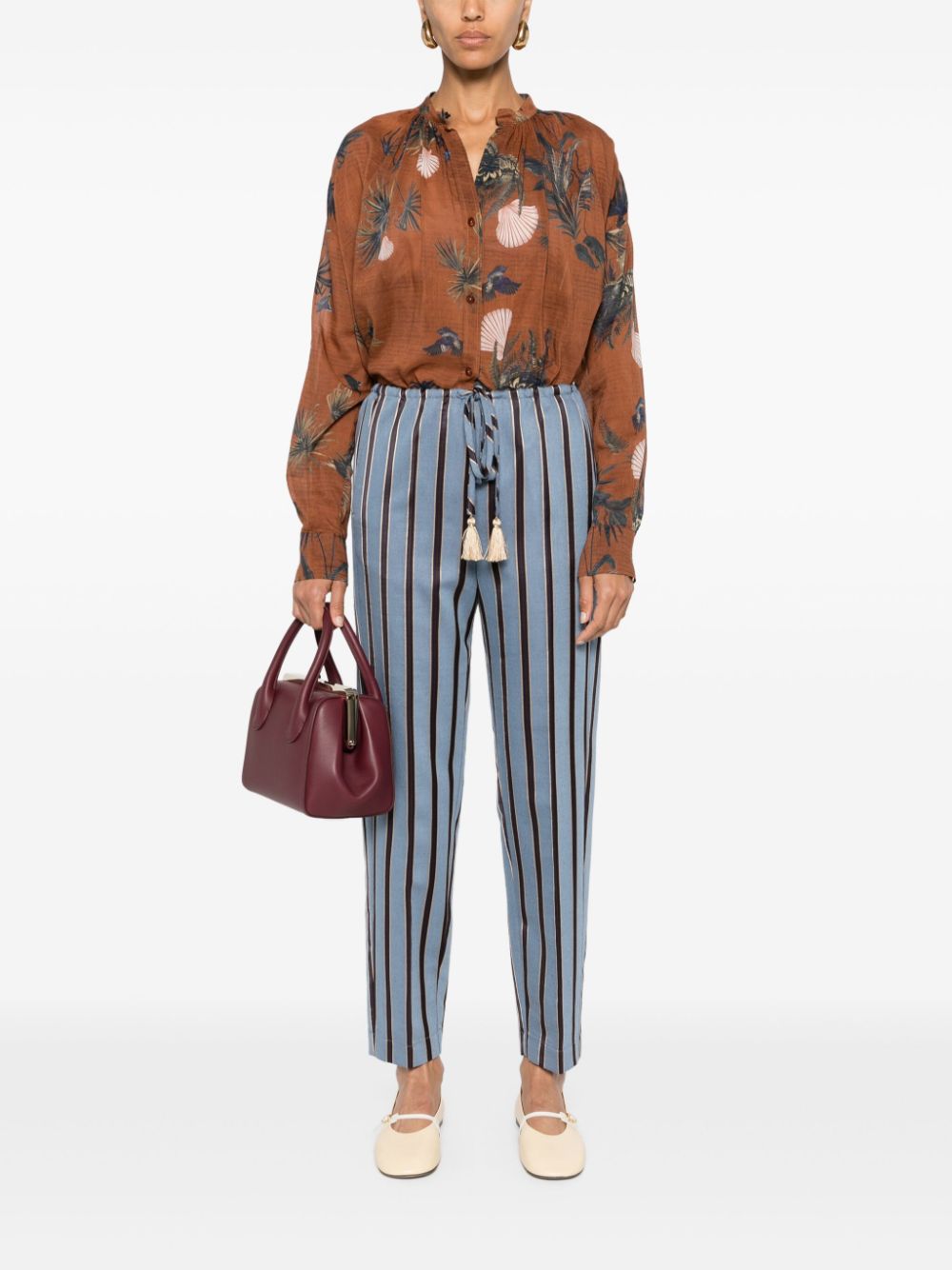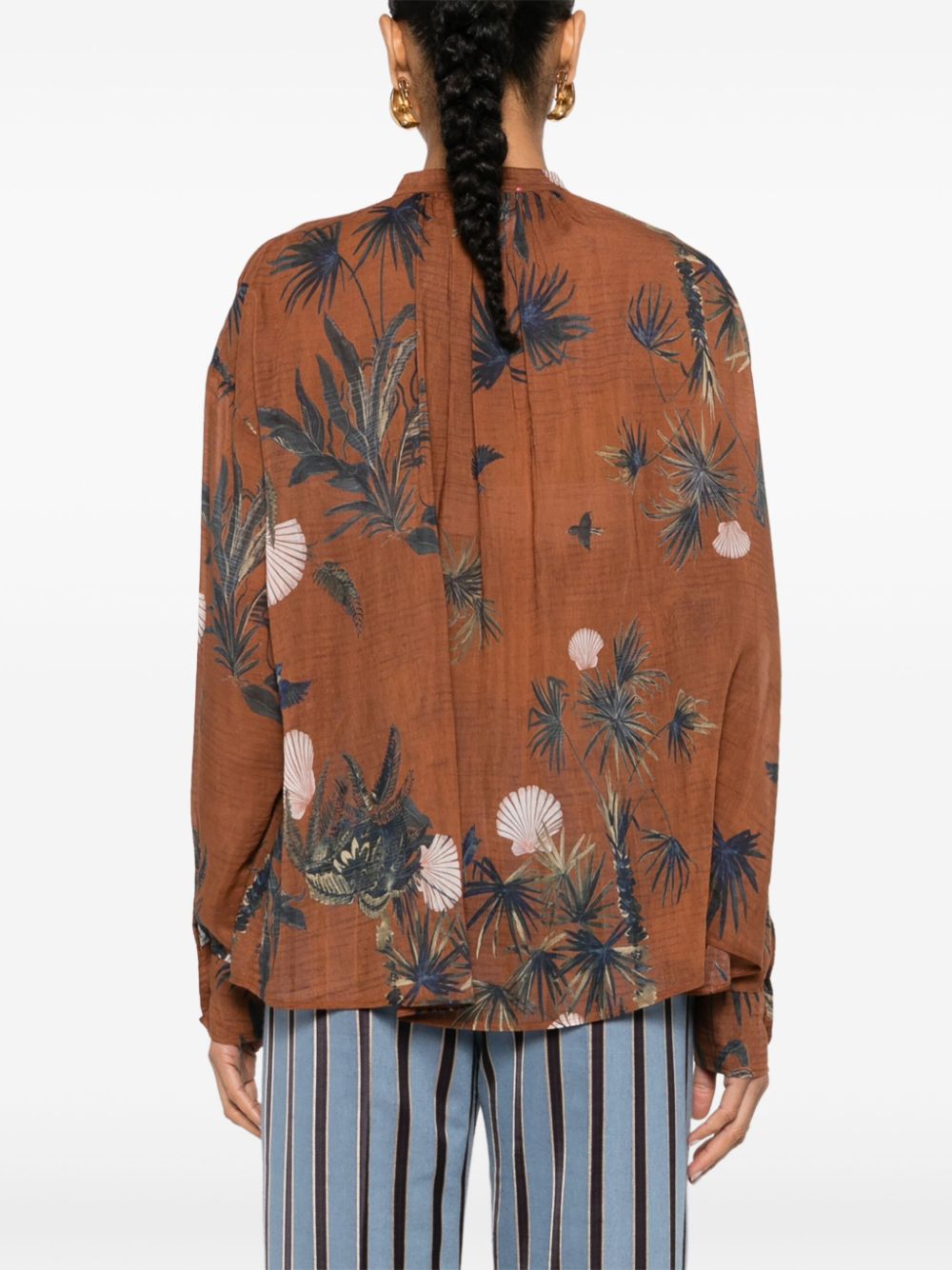 earth brown/multicolour cotton-silk blend semi-sheer construction all-over seashell and floral print ruched detailing keyhole neck front button and hook fastening drop shoulder long sleeves buttoned cuffs curved hem