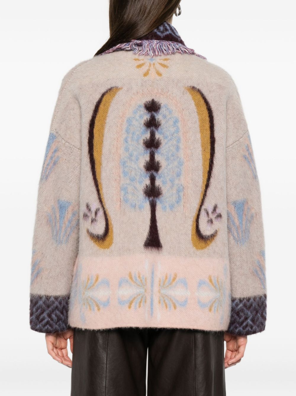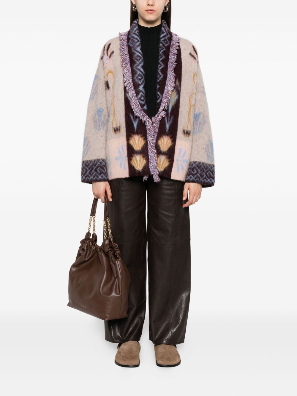 ivory geometric pattern embroidered flamingo motif fringed trim
