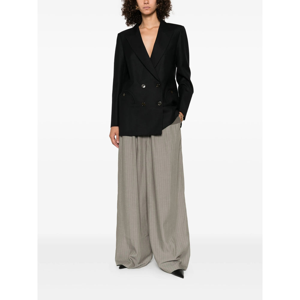 black virgin wool double-breasted button fastening peak lapels shoulder pads long sleeves buttoned cuffs chest welt pocket two front button-fastening jetted pockets straight hem English rear vents internal patch pockets