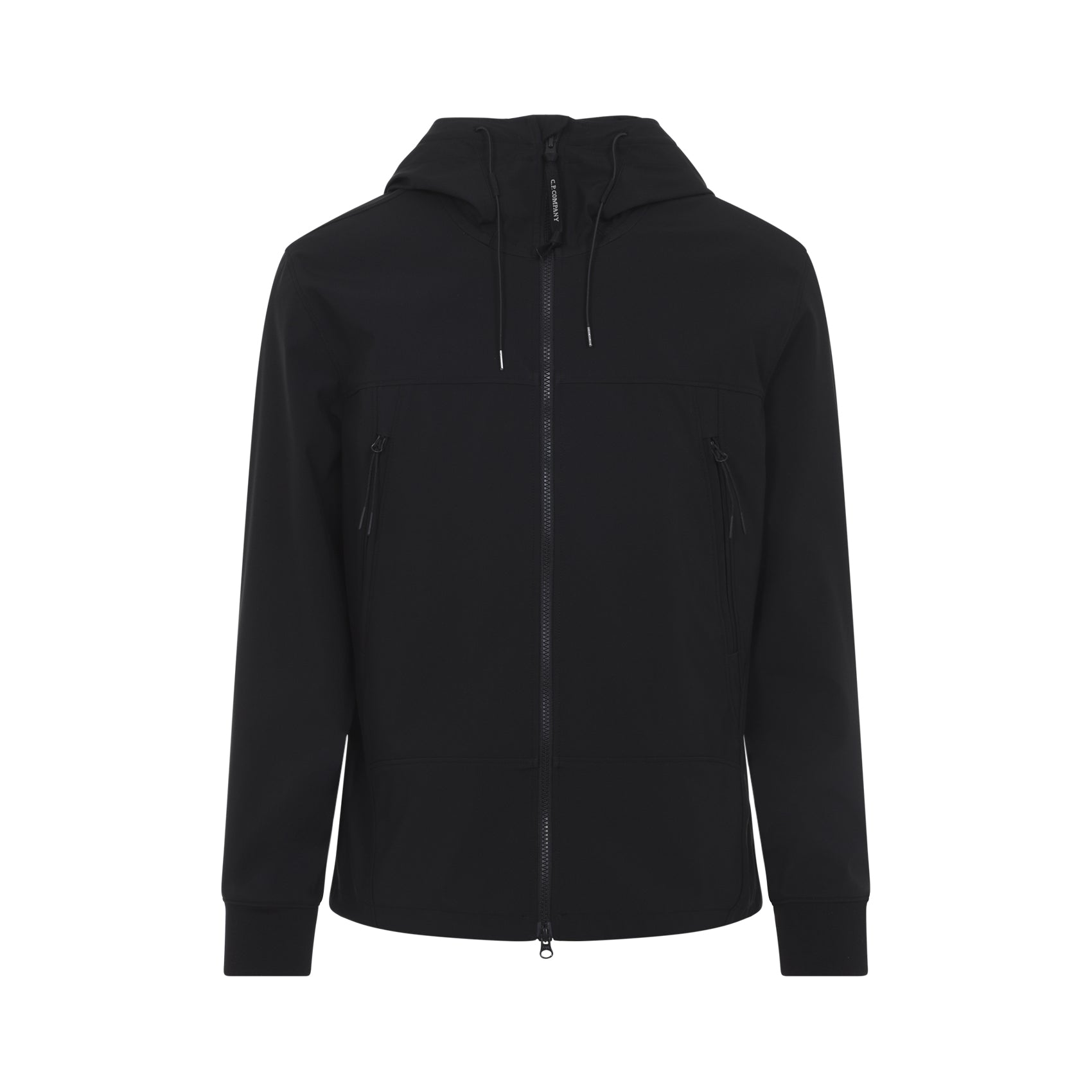 Cp Company Shell-R Goggle Black Polyester Jacket. Crafted from black softshell stretch, it features a hood with the iconic Goggle Lens and drawstring, a front two-way zip fastening with branded textile puller, two zip pockets on the front, long sleeves with ribbed cuffs, and a concealed drawstring at the hem. The jacket is windproof and water-repellent.
